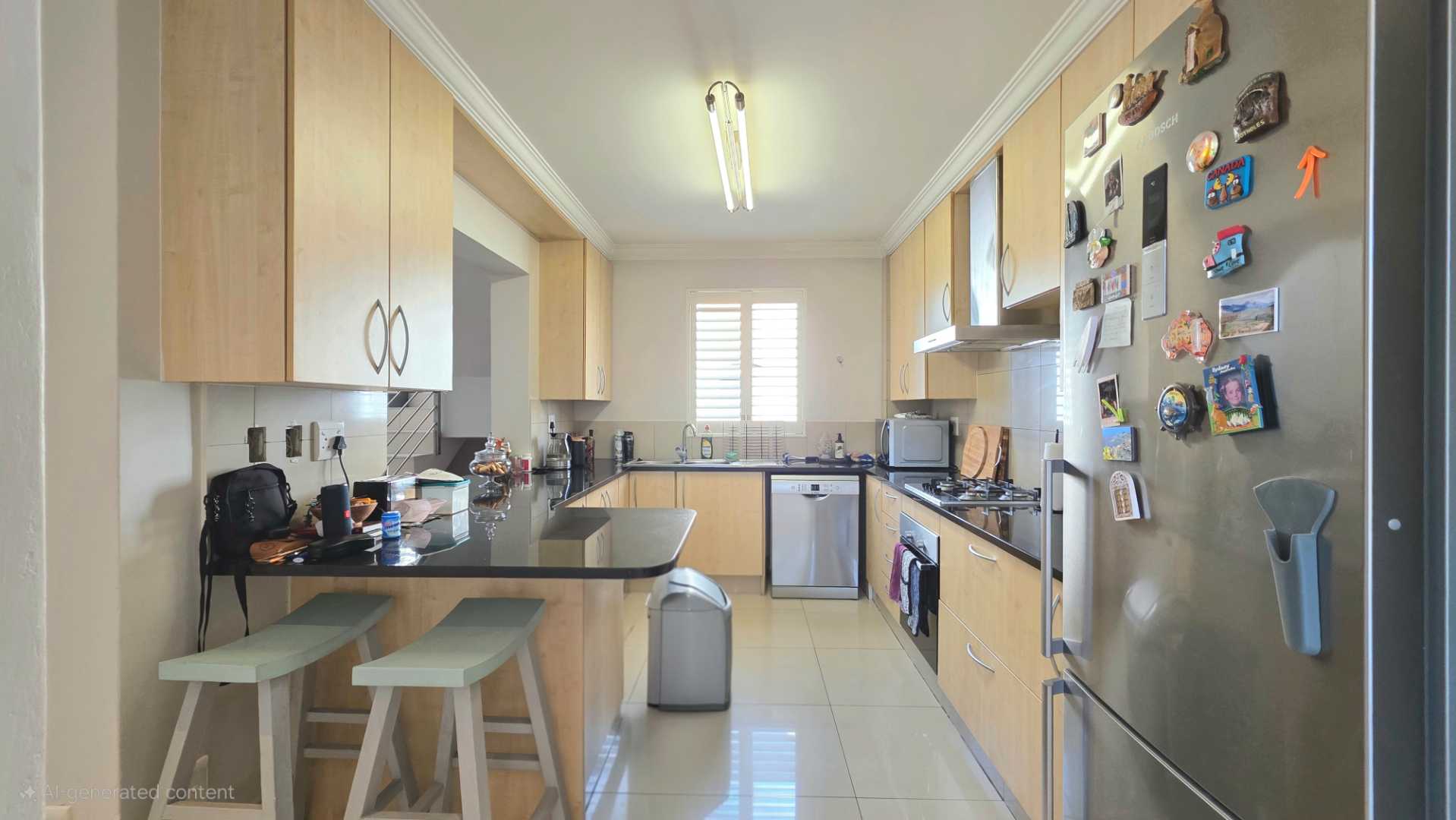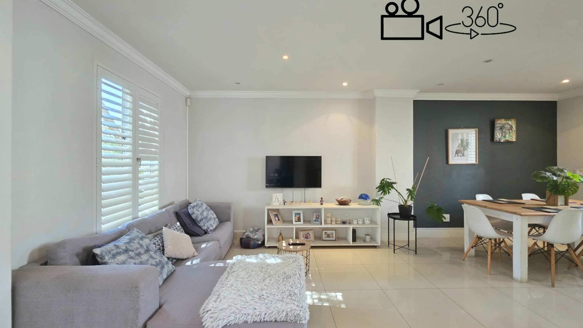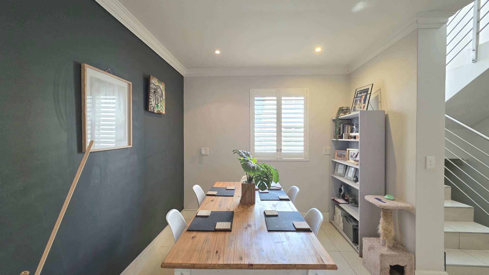 As you ascend the staircase, you are welcomed by an elegantly proportioned open-plan reception area, finished with sleek porcelain tiles and framed by shutter-covered windows that allow natural light to stream through, creating a bright and sophisticated ambiance.