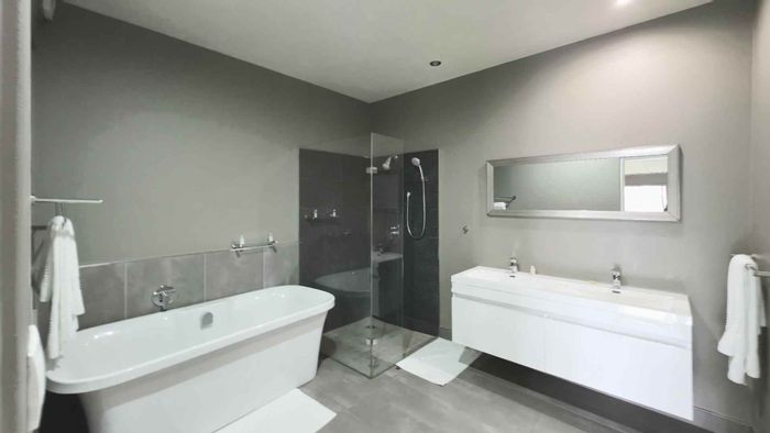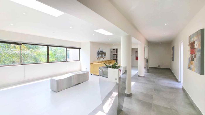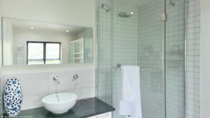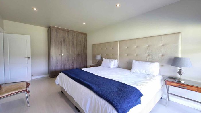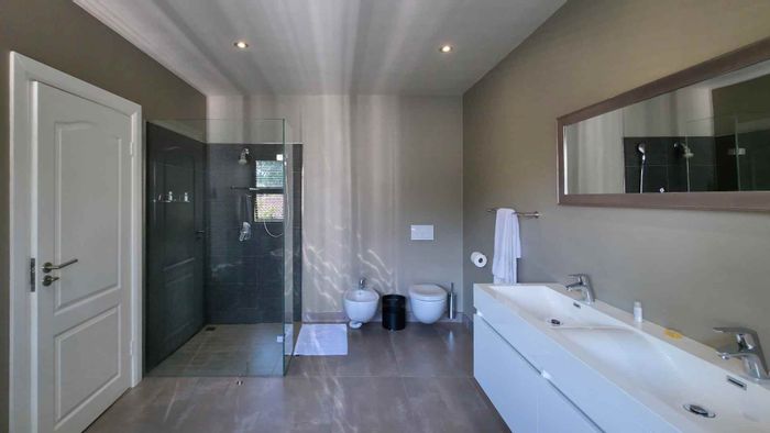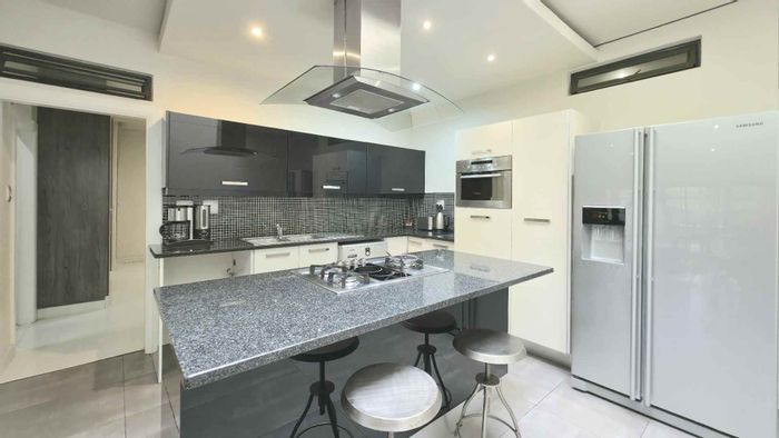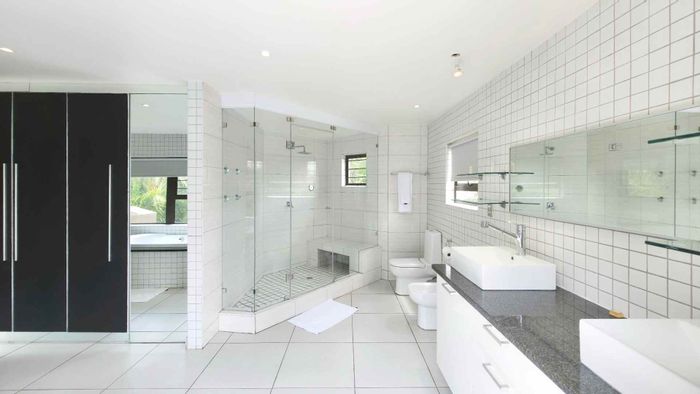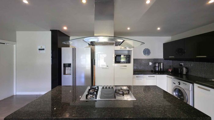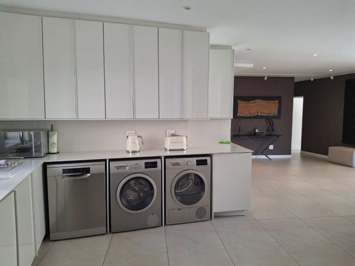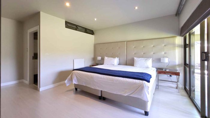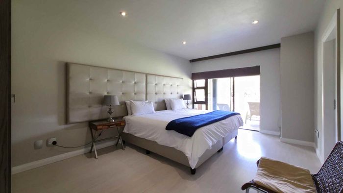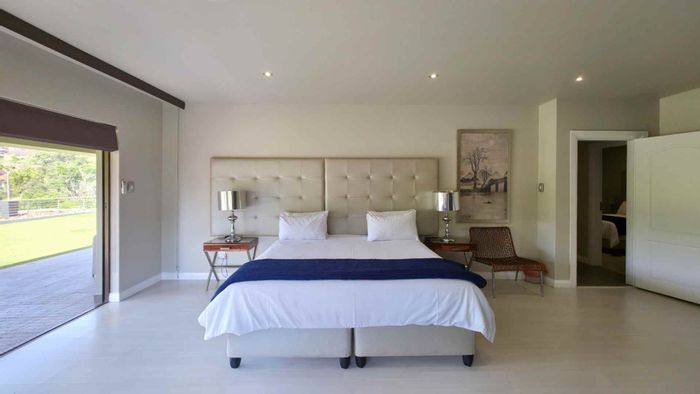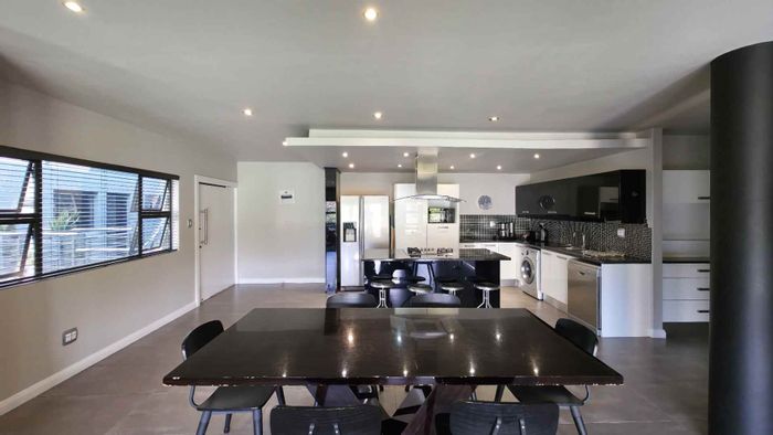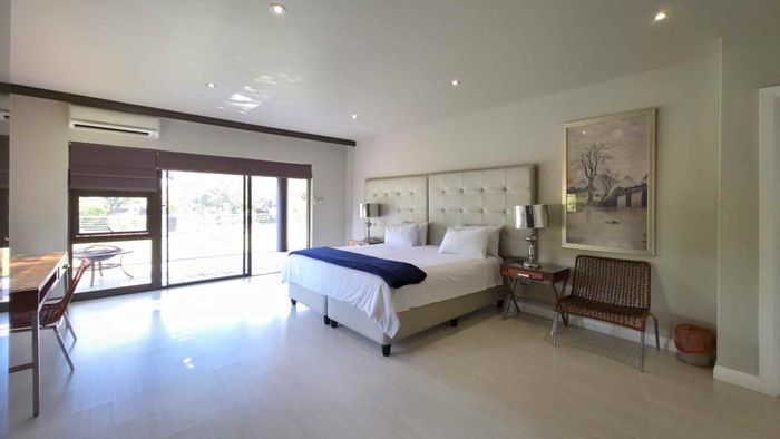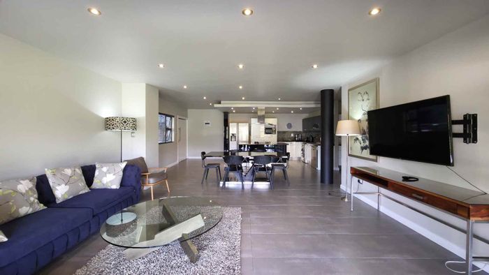 Experience executive riverside living with treetop and river views, expansive double-volume living and covered alfresco braai overlooking landscaped grounds; four en-suite bedrooms and two automated garages.