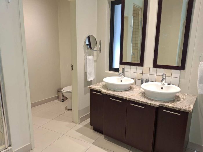 Live steps from Benmore Shopping Centre and Sandton's vibrant amenities with a sunlit north-facing balcony, concierge, pool/gym access — fully furnished two-bedroom, two-bath apartment with double garage.