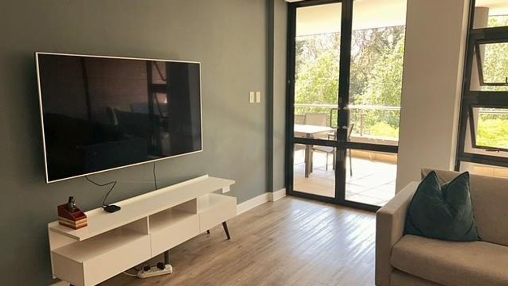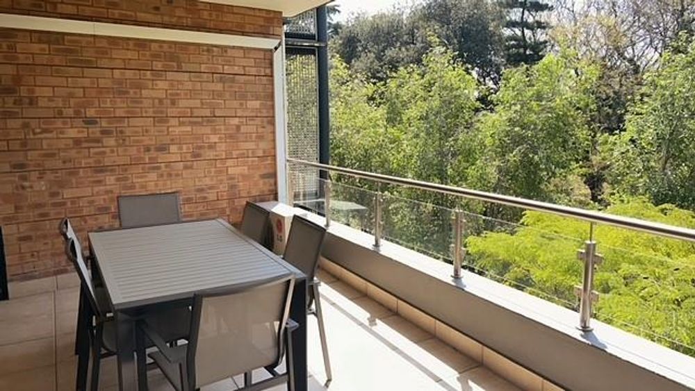 Enjoy sophisticated urban living in Sandton's Ten Degrees, steps from Benmore Shopping — furnished north-facing two-bedroom, two-bath apartment with a balcony overlooking treetops and birdlife.