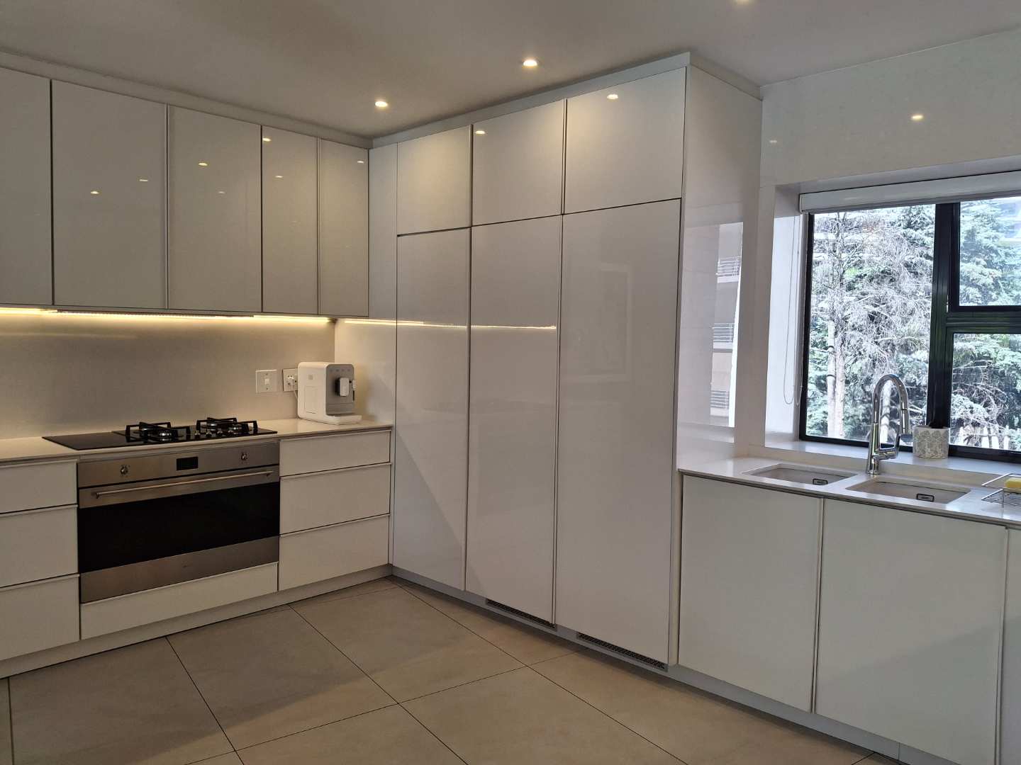 A show-stopping white kitchen, fully equipped with Bosch and Smeg appliances, including a gas oven, and generous storage