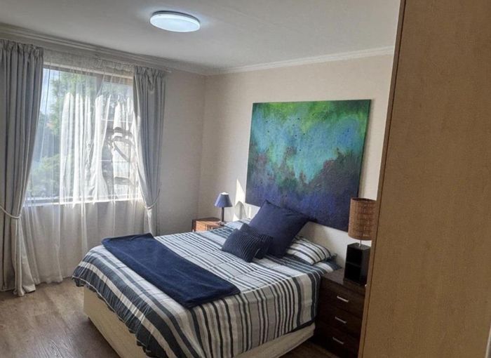 Effortless entertaining with a poolside built-in bar and glass stacking doors to the estate’s largest garden with a lemon tree, minutes from Sandton CBD and Gautrain — five bedrooms.