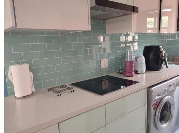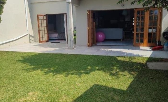 Bright corner garden unit with largest private lawn, direct pool access and parking at door — open-plan kitchen with subway tiles, patio; minutes to Gautrain, Sandton CBD. 2 beds, 1.5 baths.