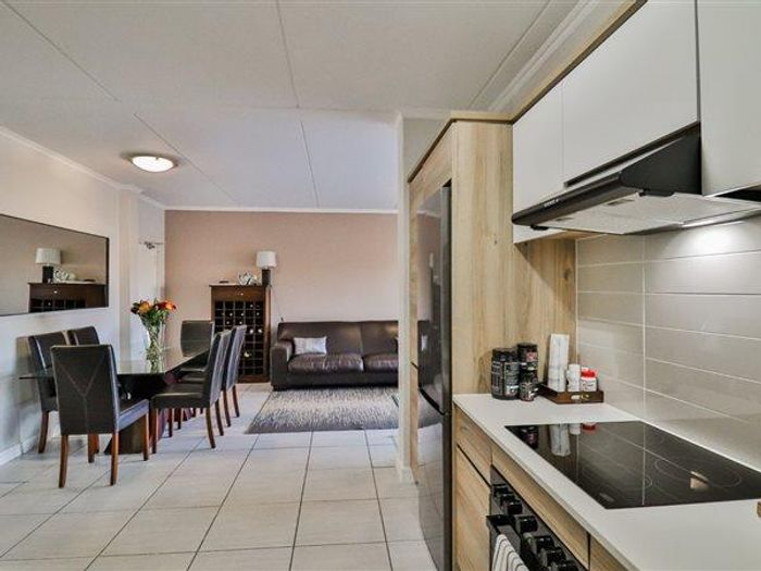 Enjoy secure, convenient living close to amenities and freeways — first-floor apartment with open-plan lounge, braai patio, modern kitchen, three beds, two baths and single garage.