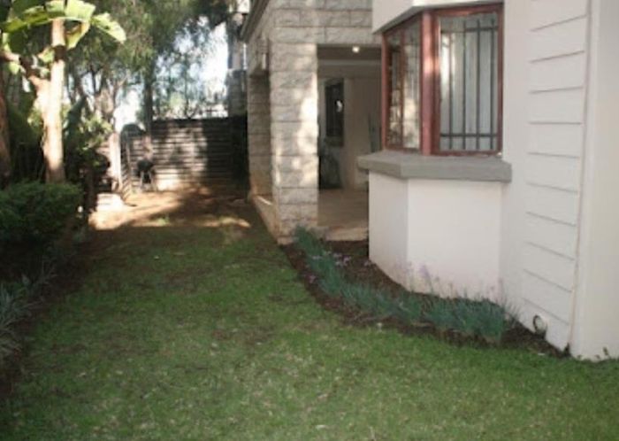 Quiet, convenient Illovo living with private balcony overlooking gardens, communal pool and reading room — walk to Thrupps, Rosebank Gautrain; one-bedroom, one-bath with basement parking.