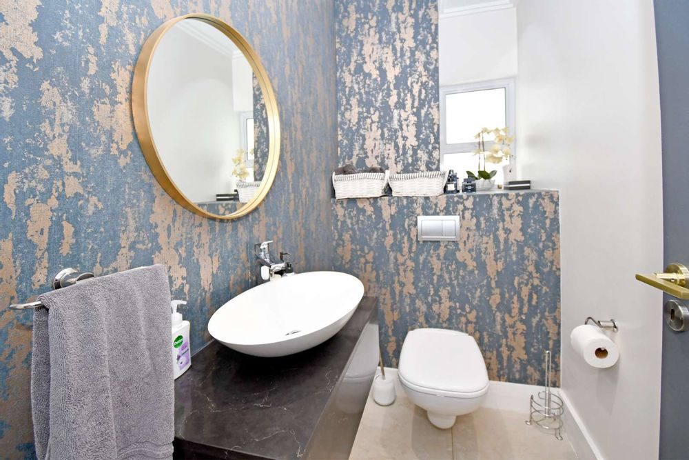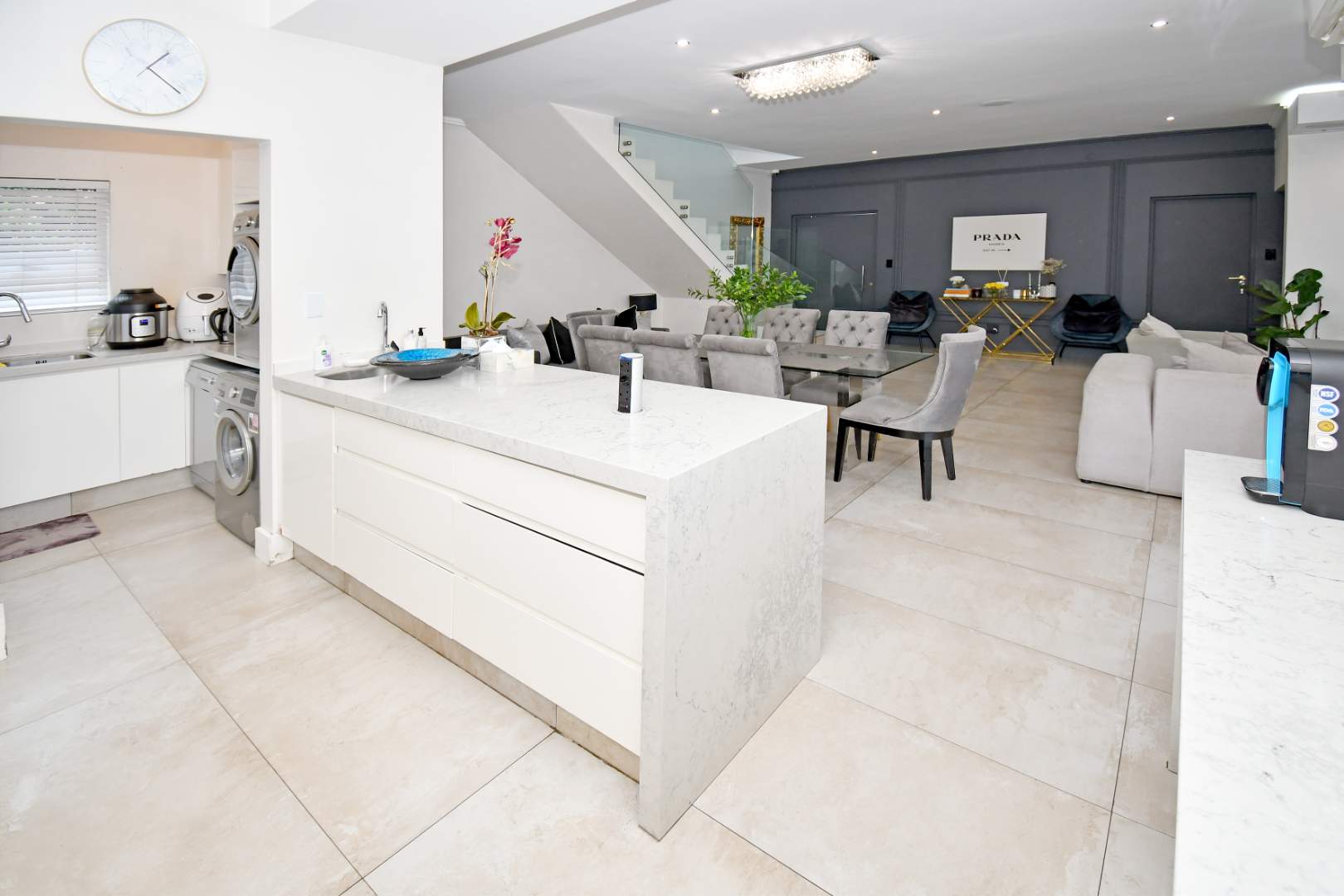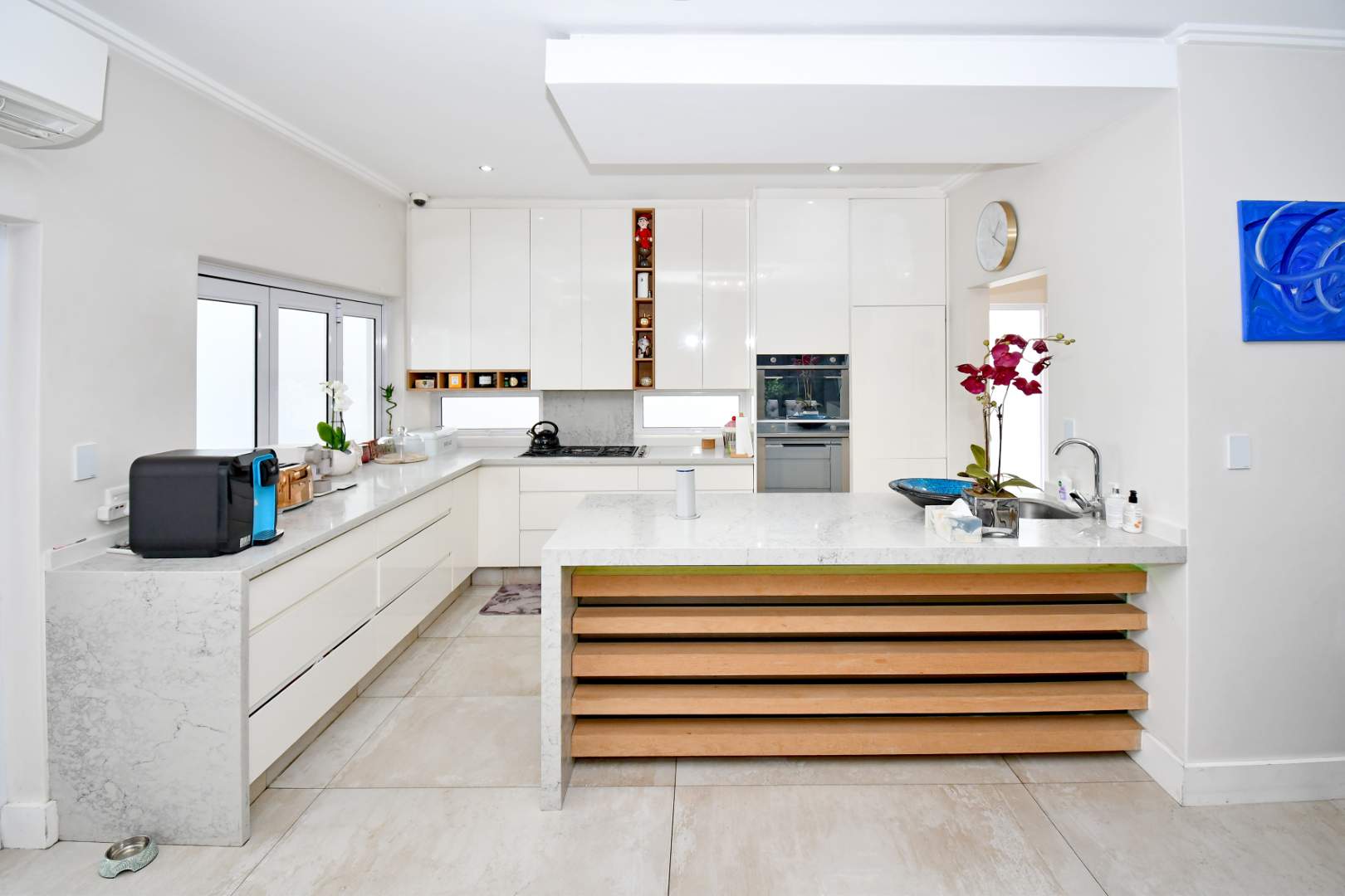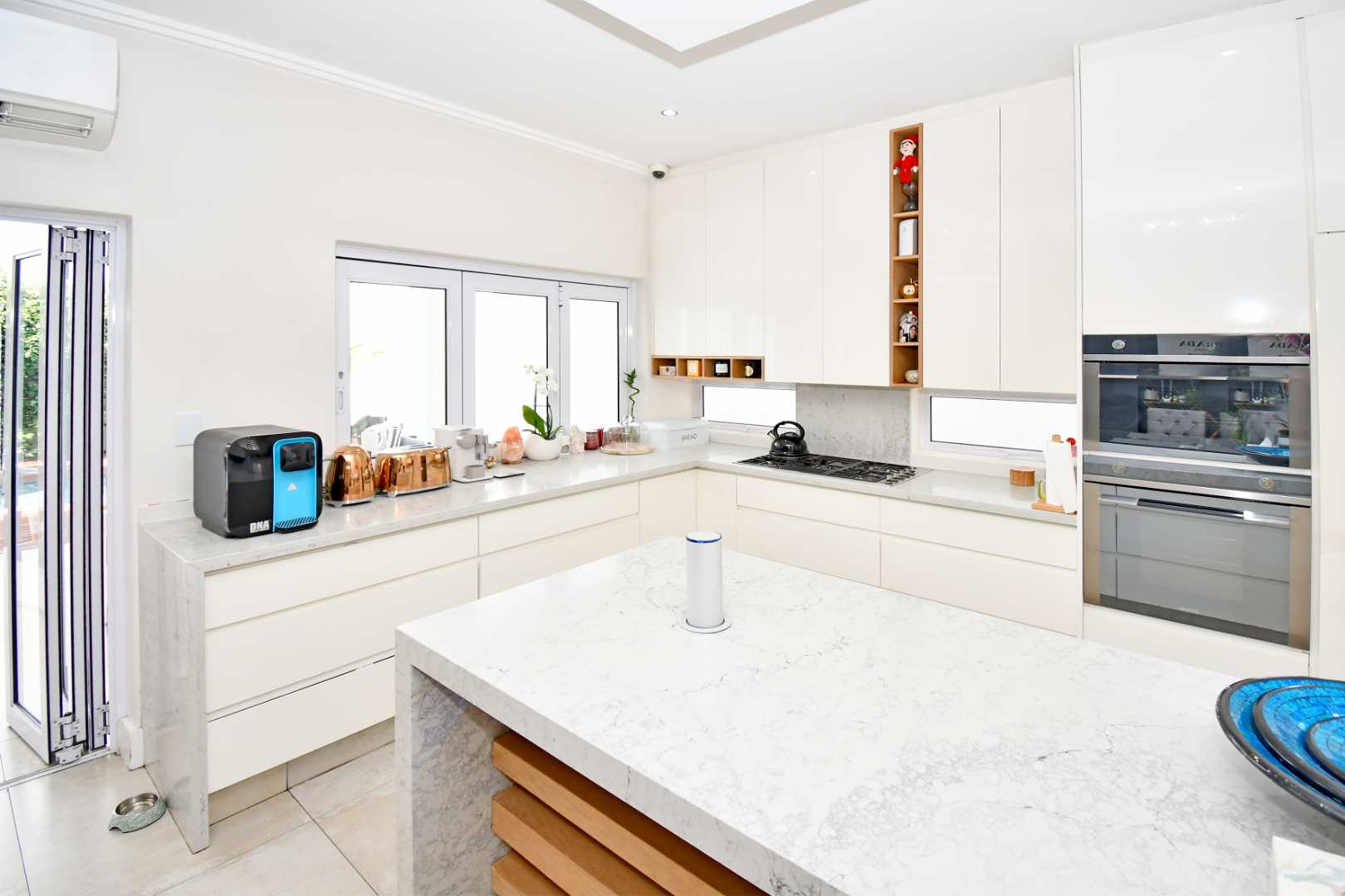Kitchen has an elegant marble look caesar stone with Smeg appliances, including a gas stove and a double oven. The cupboards and drawers are soft touch with a high gloss white Dulco ( Is it duco or dulco . Should we not just leave this word out ) finish. The separate scullery has space for 3 appliances