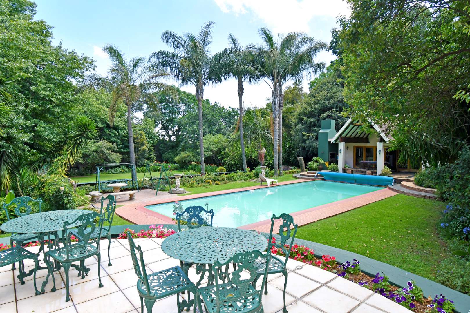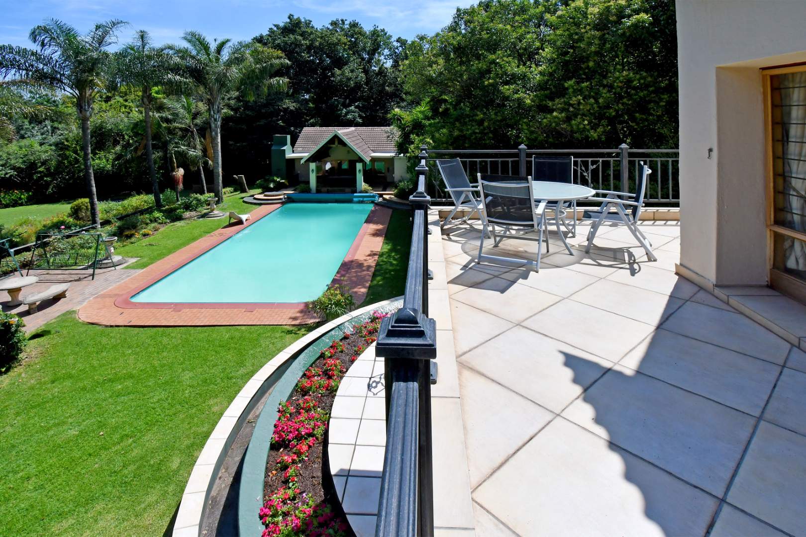 - Fully equipped pool house / entertainment suite with kitchen, bar, steam room, bathroom, undercover patio and built-in braai