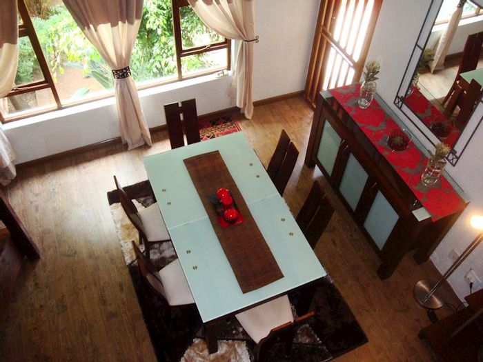 Secure estate living in Rockleigh, Woodmead — easy access to highways and shopping, private garden and pool, five-bedroom duplex with four bathrooms and two garages.