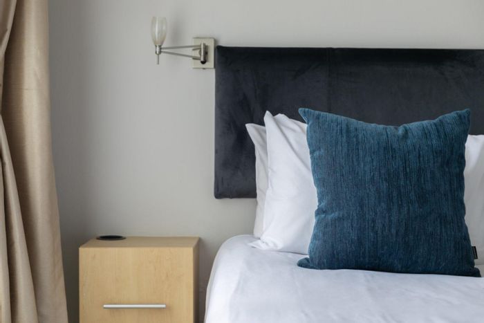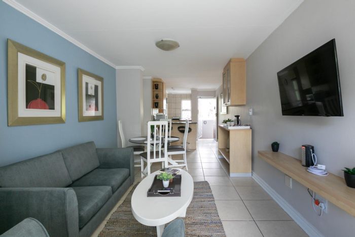 Urban convenience steps from Melrose Arch — fully furnished Melrose North garden apartment with private garden and covered patio, one bedroom, one bathroom and covered parking.