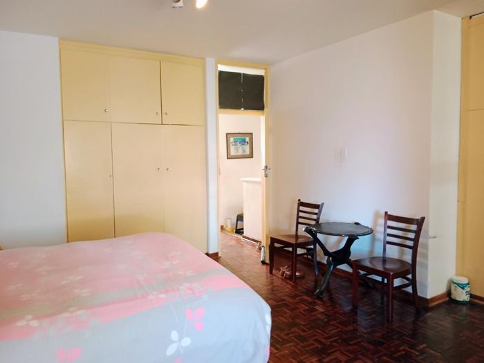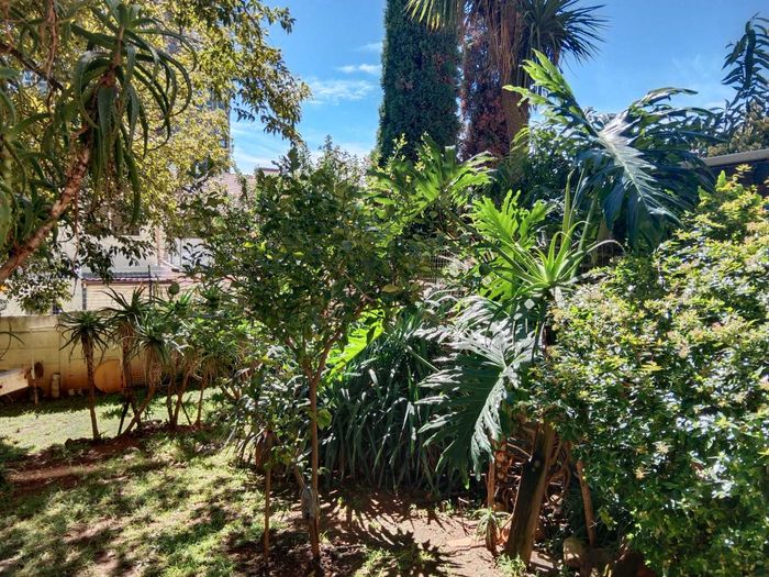 Sunlit, low-maintenance living on a quiet boomed-off road minutes from Grayston and Outspan — renovated apartment with parquet flooring, tree-view study nook, one bed, one bath, garage.