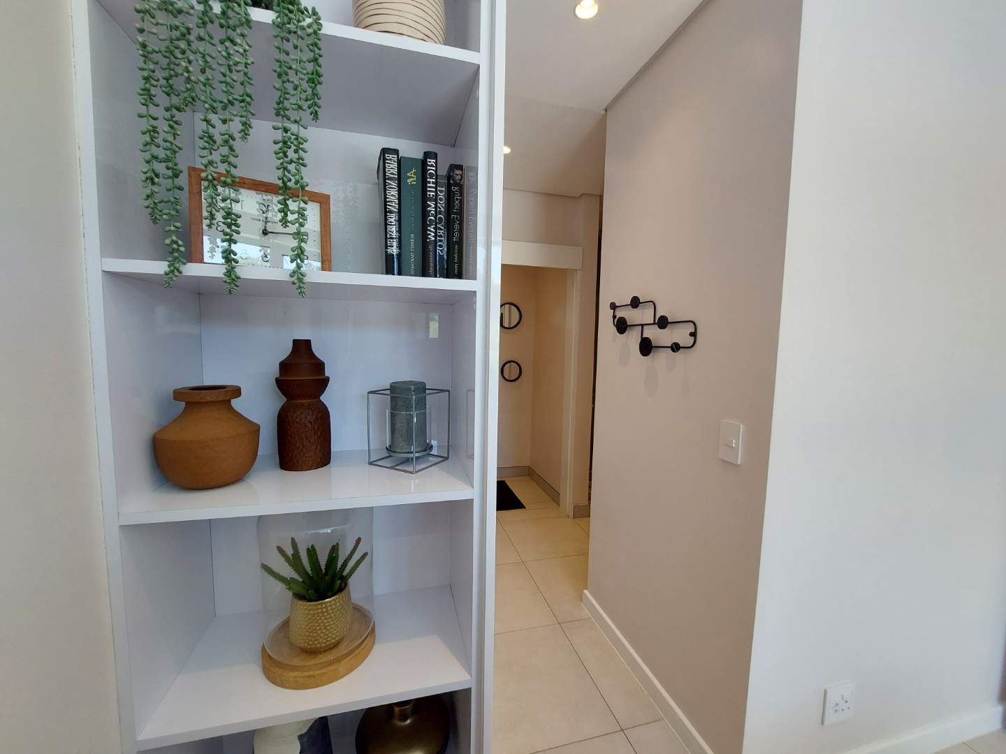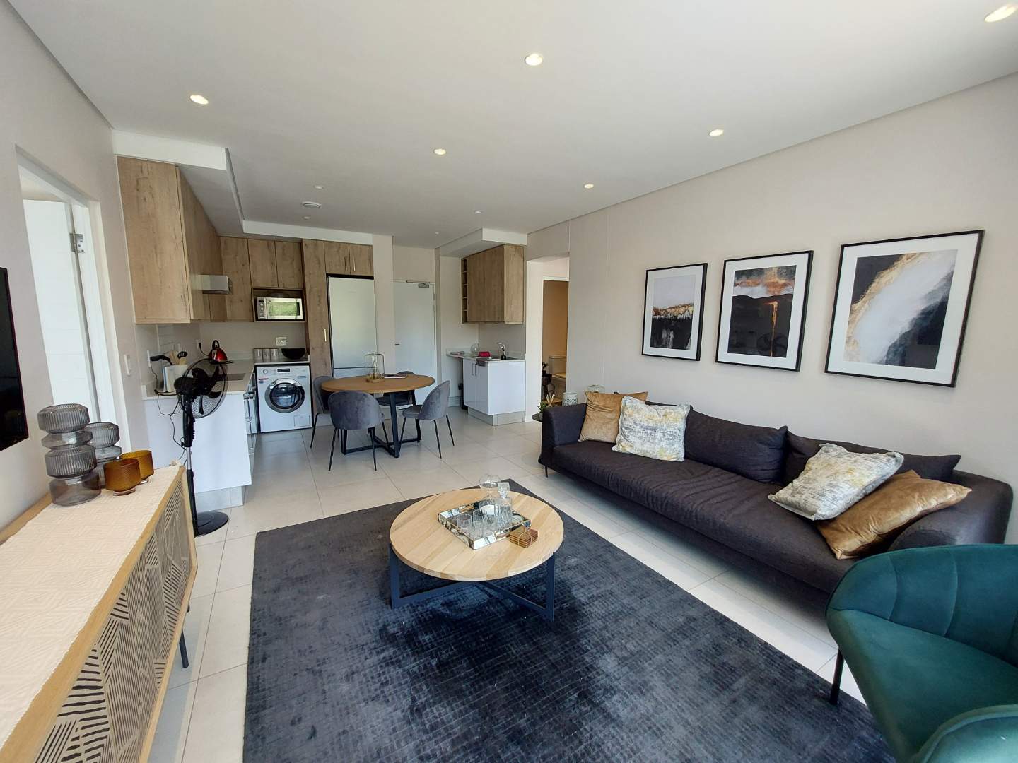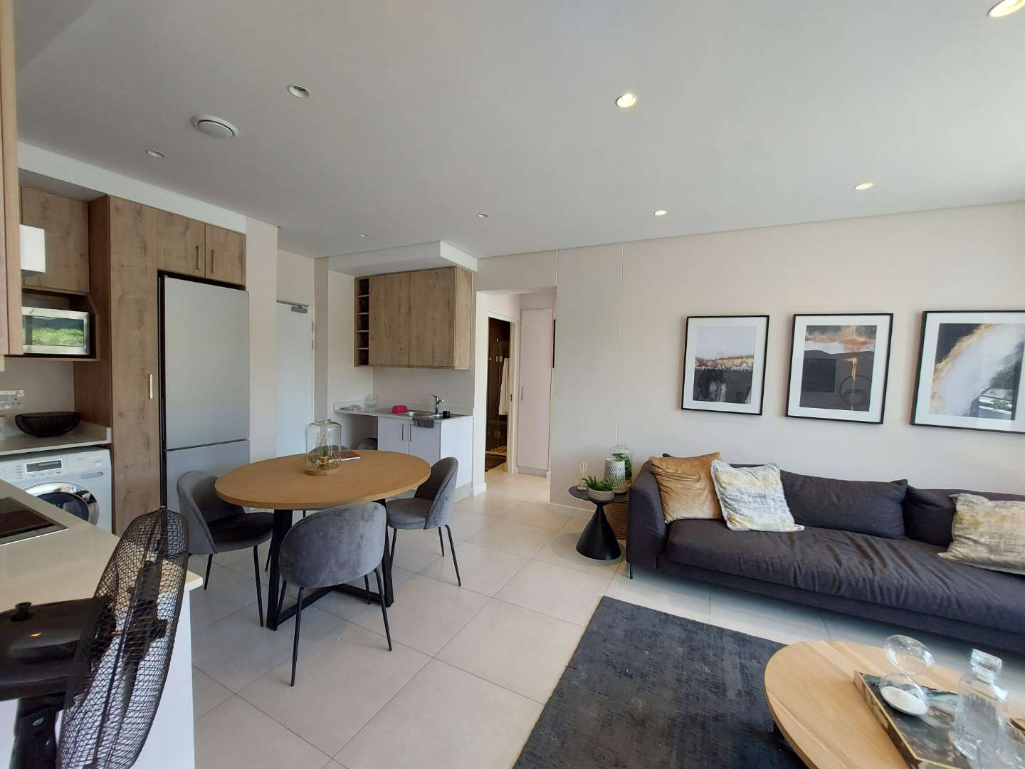 Sleek tiled flooring and modern downlighting enhance the apartment’s polished, upmarket aesthetic. The spacious open-plan living area flows seamlessly through double-glazed stacking doors onto a private balcony, ideal for relaxed indoor-outdoor living.