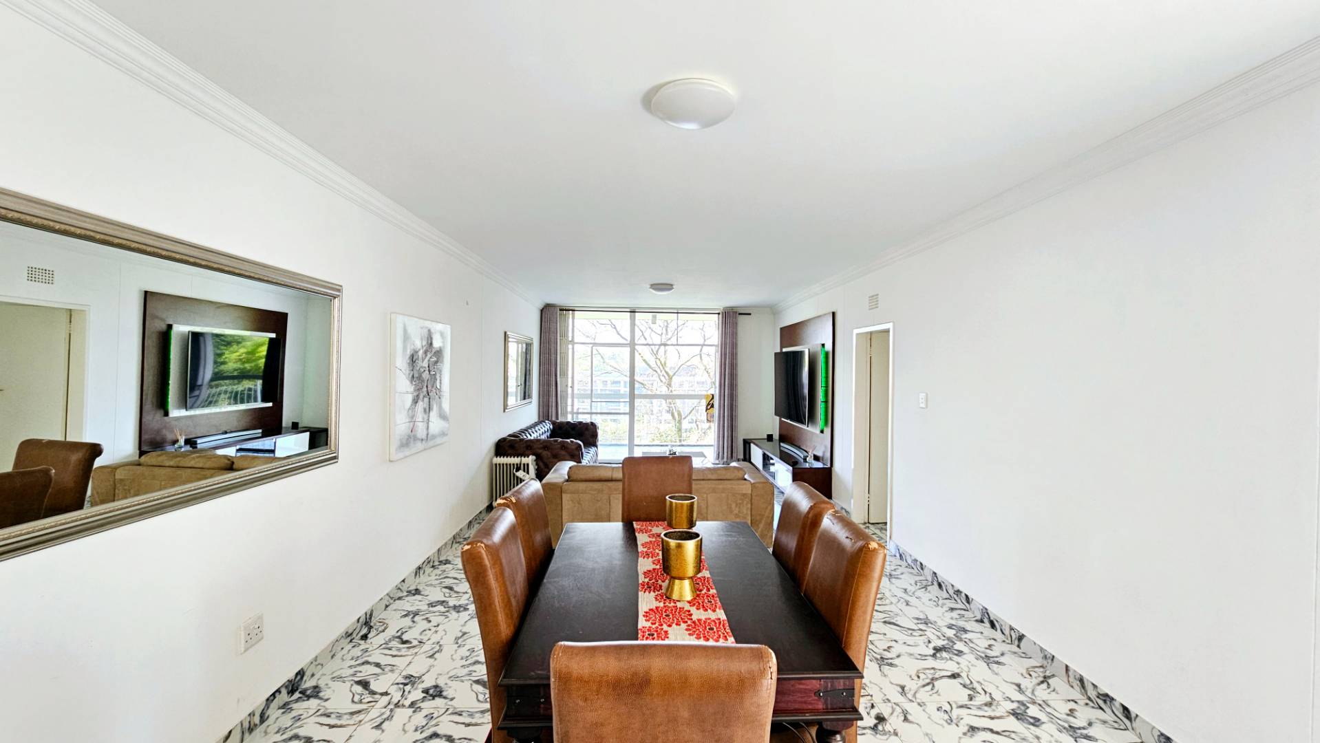 As you step inside, you'll be greeted by stylish porcelain tiles that adorn the expansive living areas, creating an elegant ambiance.