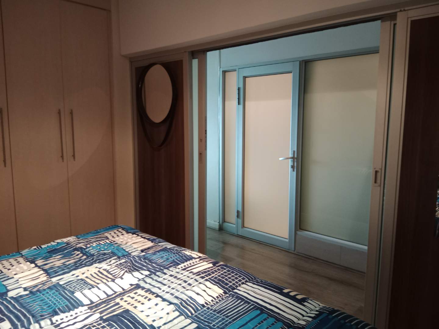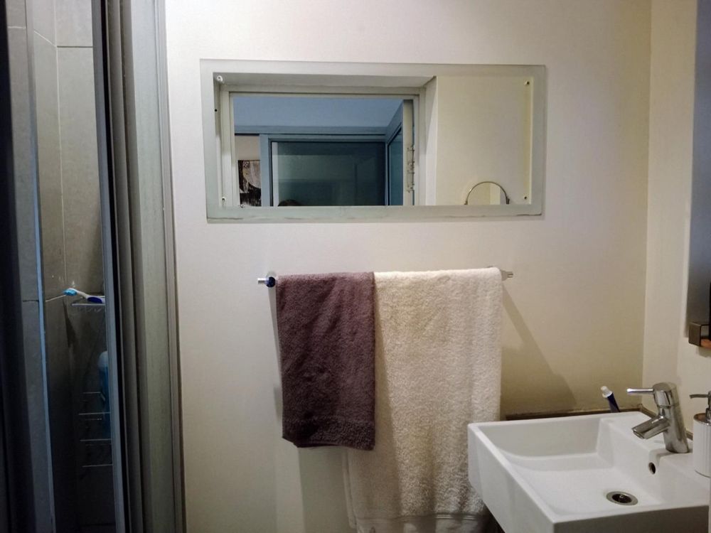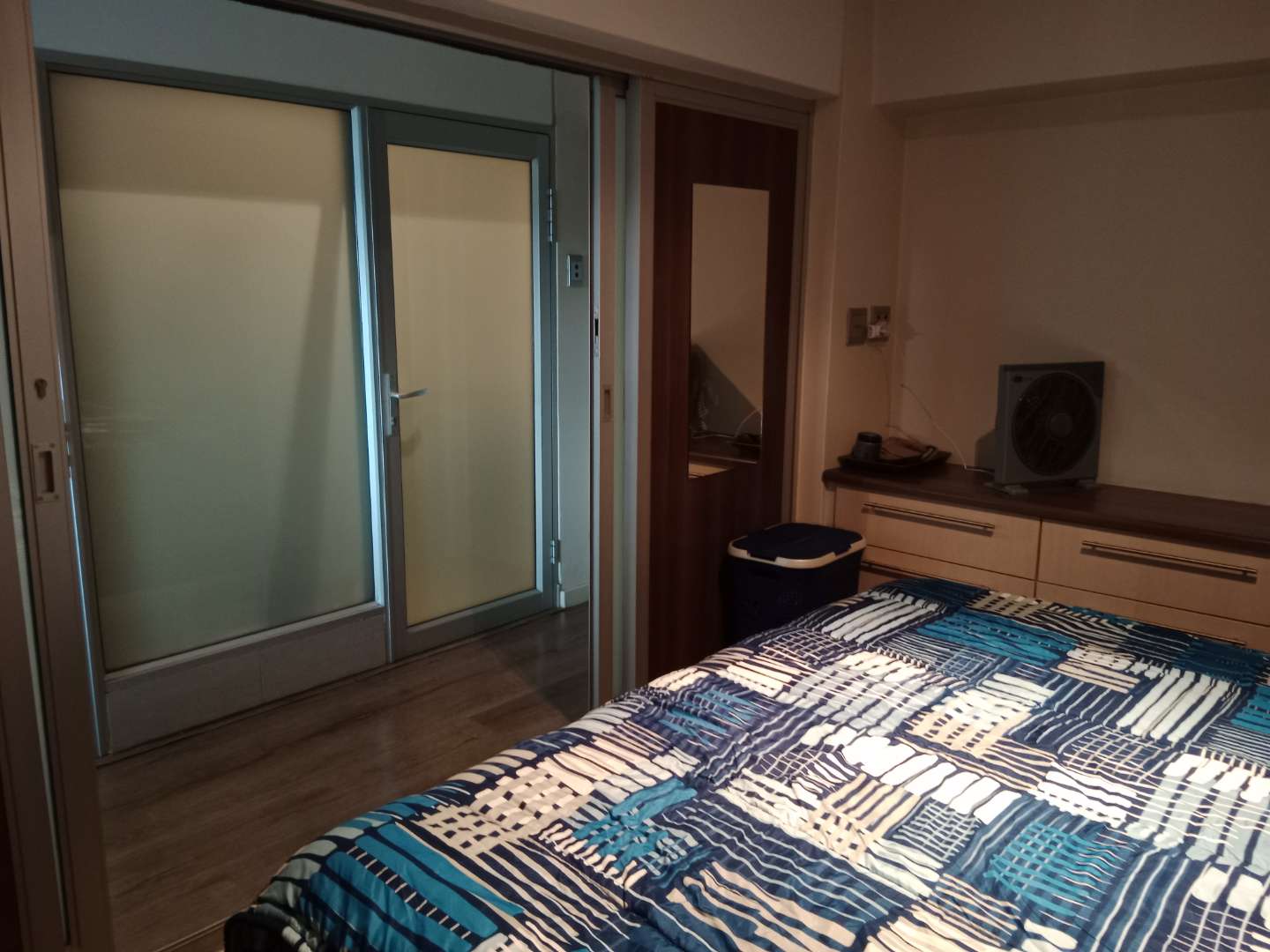 The bedroom is warm and inviting, featuring built-in cupboards and easy access to a separate bathroom fitted with a shower