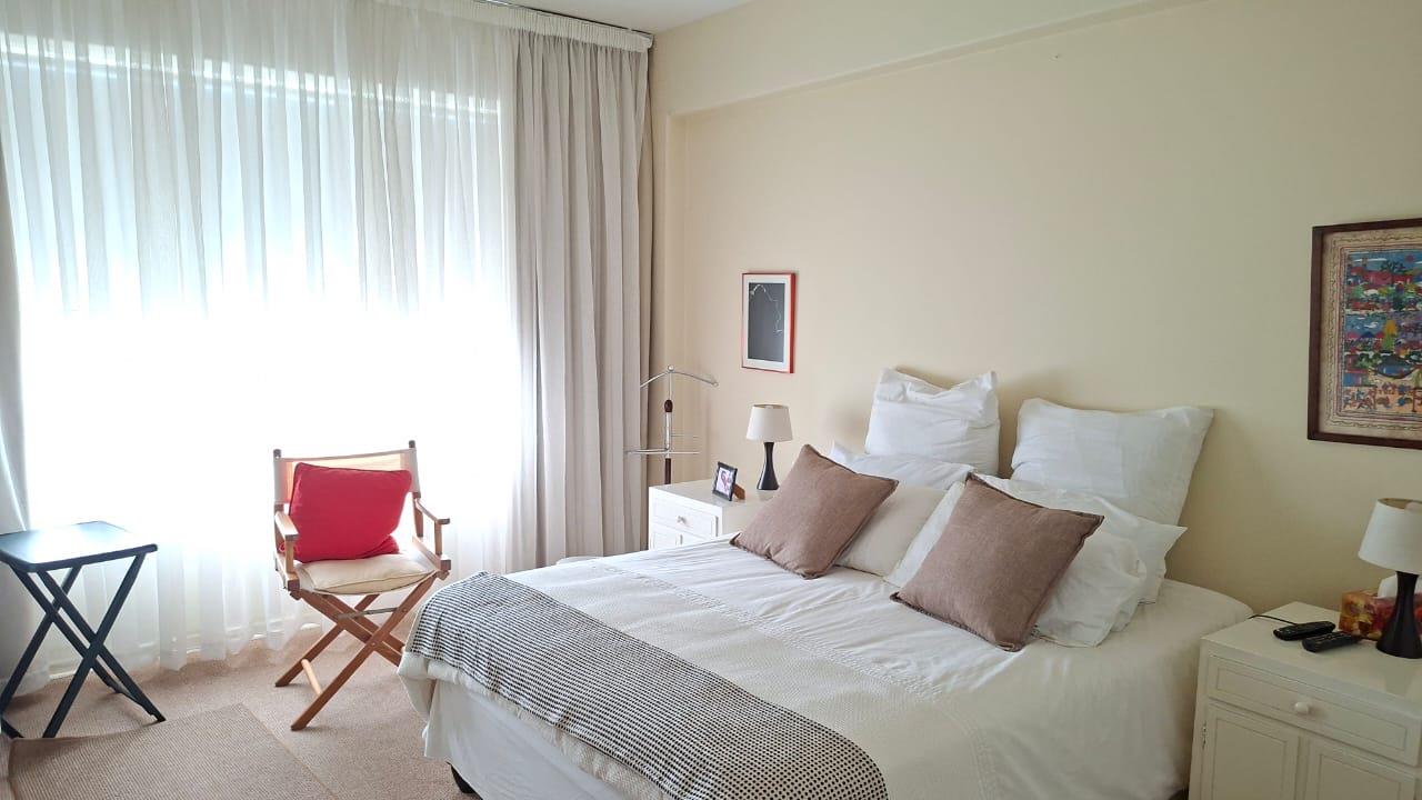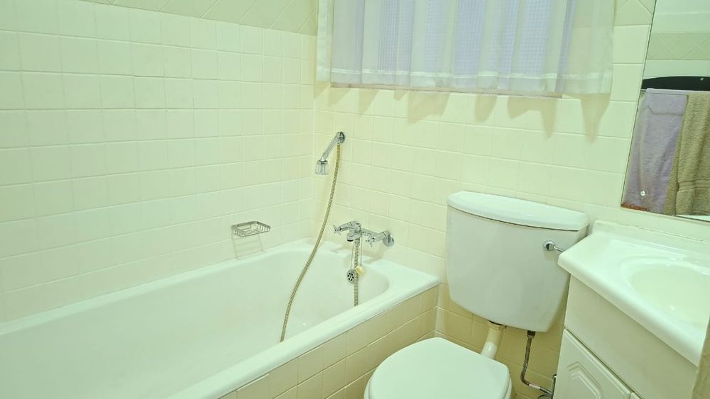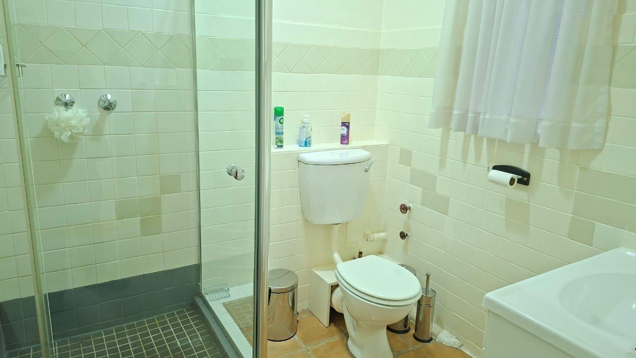 One bathroom has a shower and toilet, the other a bath and toilet.