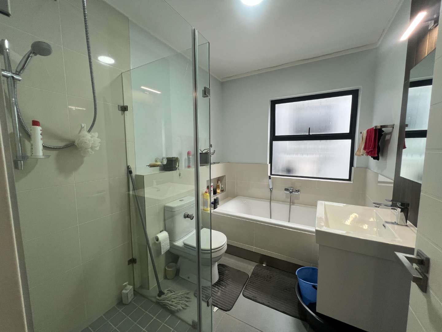 The apartment features two spacious bedrooms, both able to accommodate queen-size beds comfortably, along with ample built-in cupboard space. The full bathroom is neatly laid out and includes a separate shower, bath, basin, and toilet.