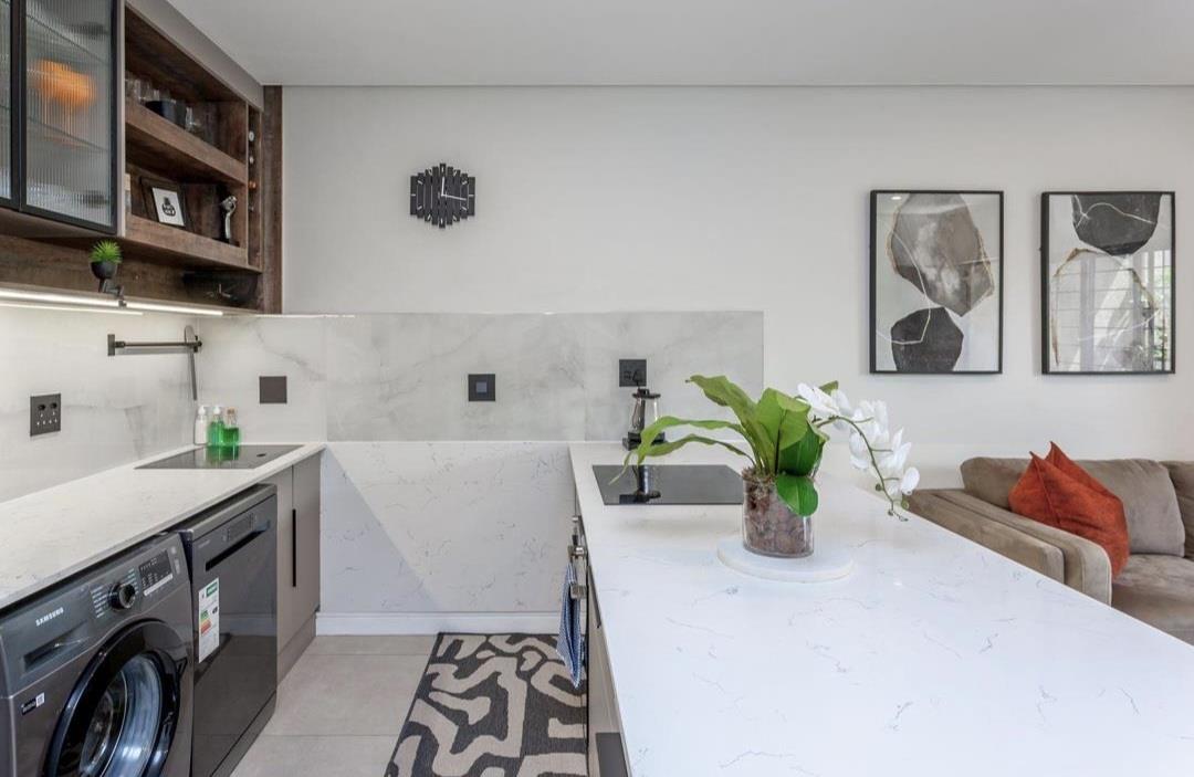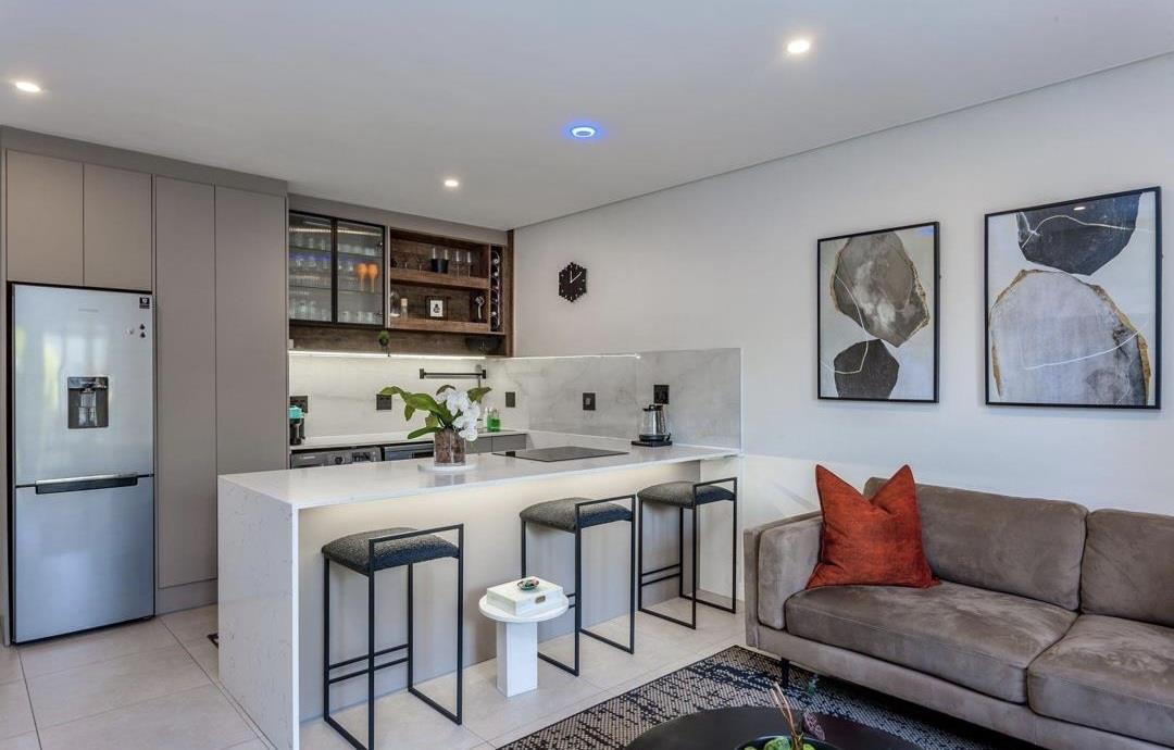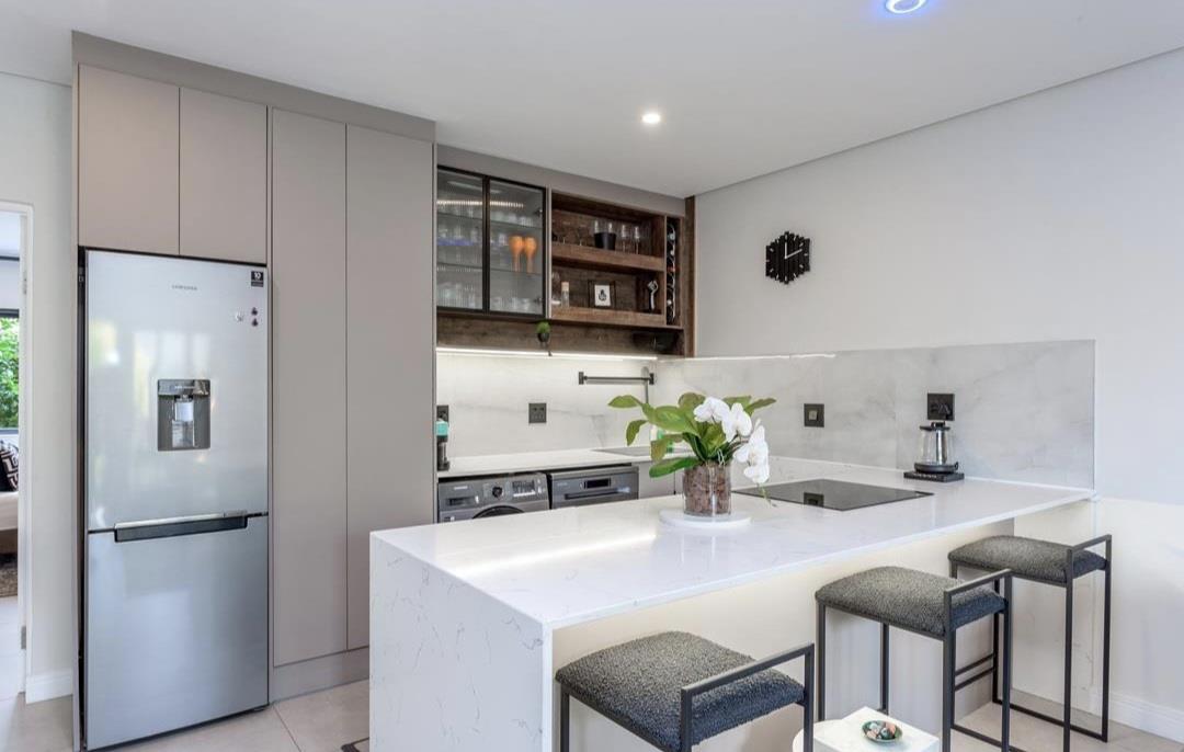 A designer kitchen complete with all appliances, marble bar counter, and sleek finishes.