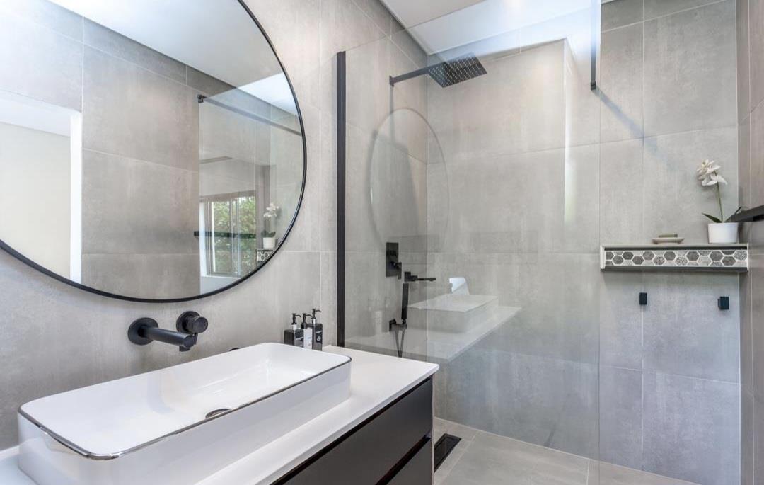 A spacious en-suite bedroom with a luxurious shower, ample cupboard space, and tasteful décor.