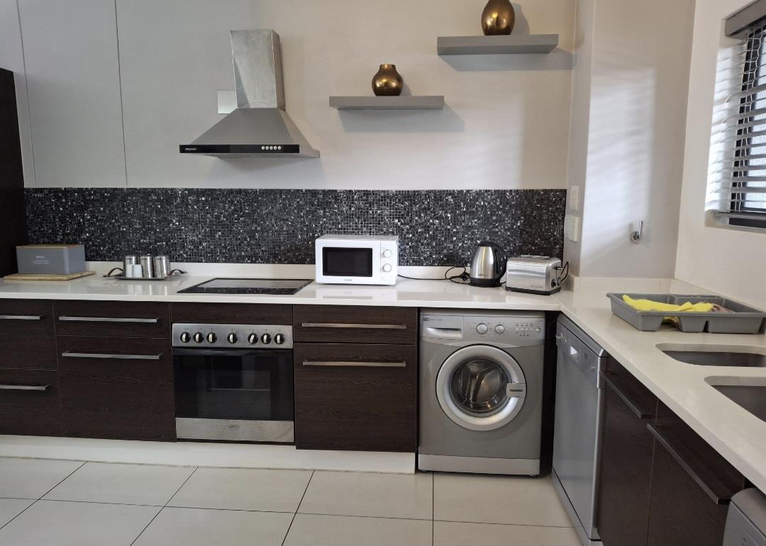 The modern, fully equipped kitchen features sleek granite countertops and quality finishes, while the apartment is tastefully furnished throughout, including a dedicated desk and work-from-home station.