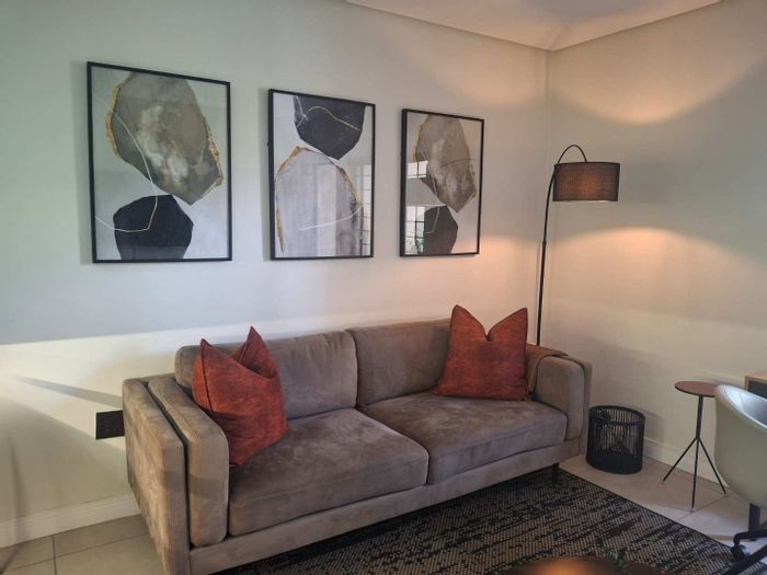 Executive urban living with effortless commutes — furnished third-floor apartment steps from Investec and Benmore shopping centre, on Gautrain bus route; 24-hour concierge, two en-suite bedrooms, 2.5 bathrooms, double garage.