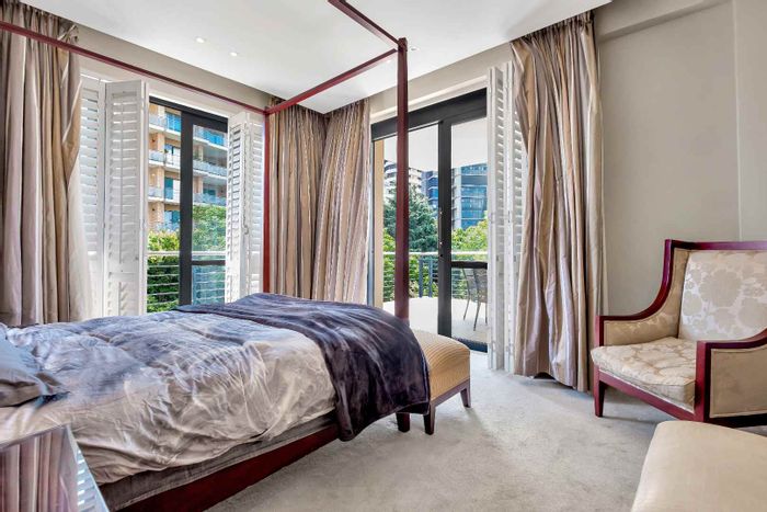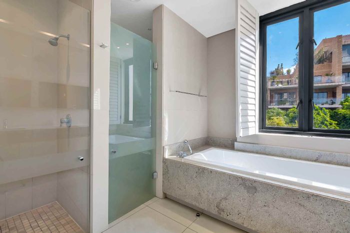 Executive city living in Sandton with airy open-plan spaces and covered balcony views — features two en-suite bedrooms and a private lift to your front door.