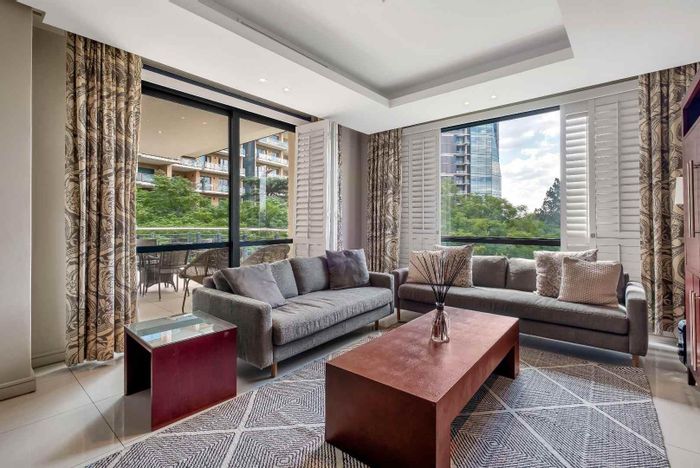 Luxury city living steps from Benmore Shopping Centre and Sandton CBD, relaxing treetop balcony views, furnished open-plan living with gym and pool — two bedrooms, two bathrooms, two parking.