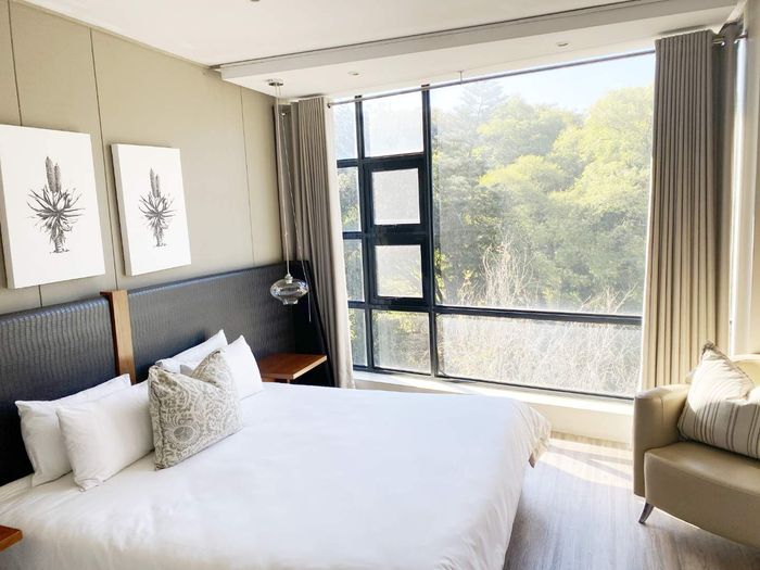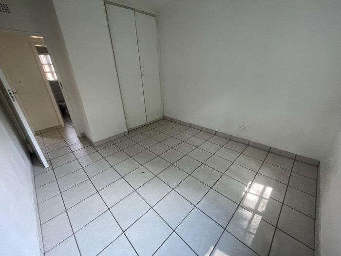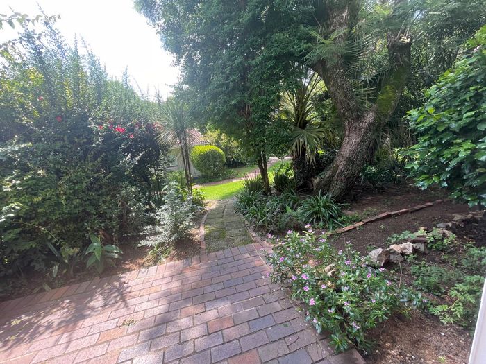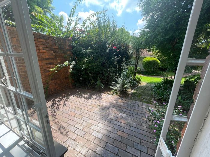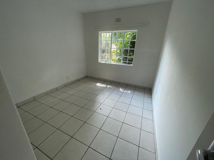 Sunlit, low-maintenance living on a quiet boomed-off road minutes from Grayston and Outspan — renovated apartment with parquet flooring, tree-view study nook, one bed, one bath, garage.