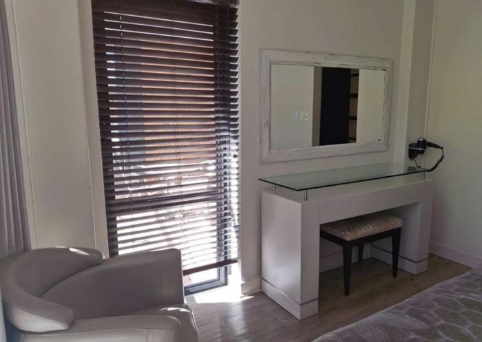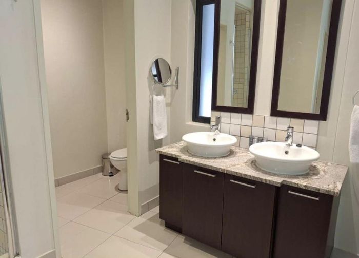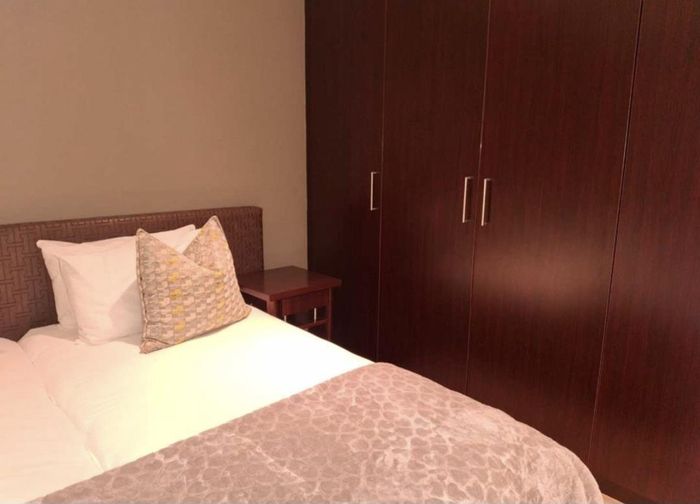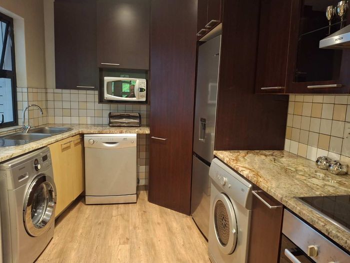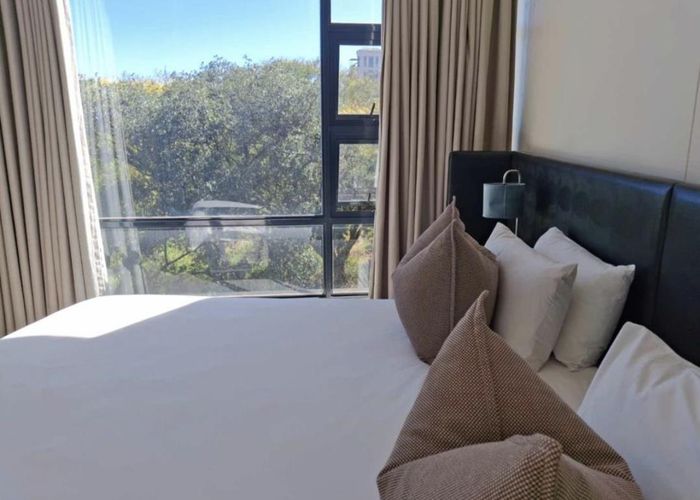 Live in Sandton's vibrant heart with leafy treetop views, furnished two-bedroom, two-bath apartment in Ten Degrees, walking distance to Benmore — gourmet granite kitchen, north-facing balcony, pool, gym, two parking bays.