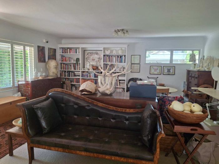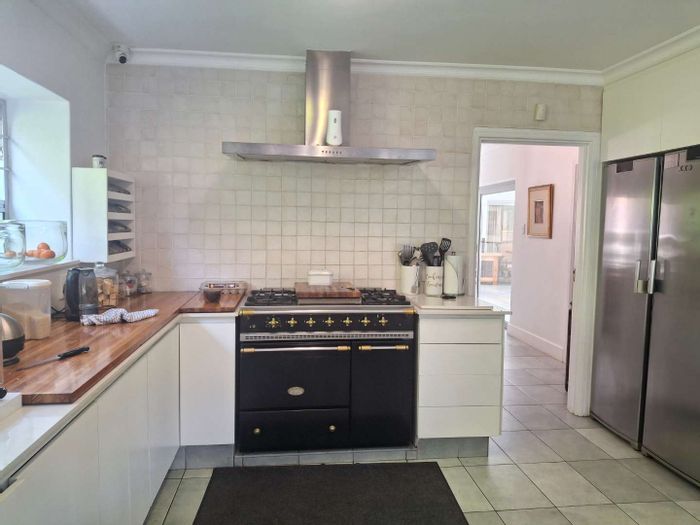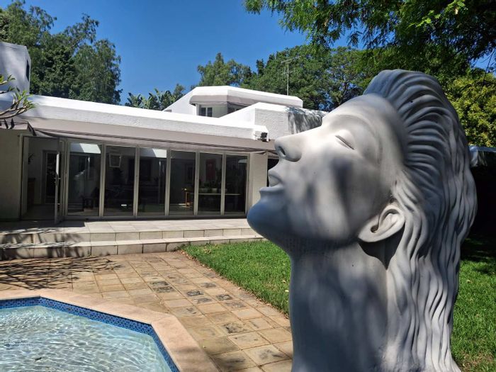 Tranquil family retreat on leafy Bruton Road, Bryanston — seamless indoor-outdoor living with a private tree-filled garden and pool, gourmet kitchen, study; four beds, three baths, four garages.