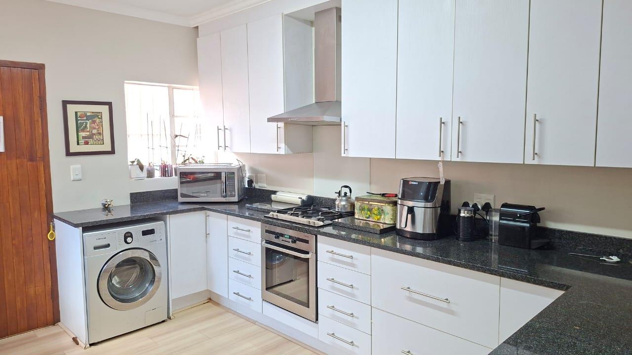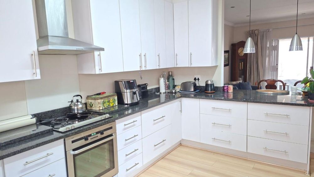 Modern kitchen with granite tops and gas hob.