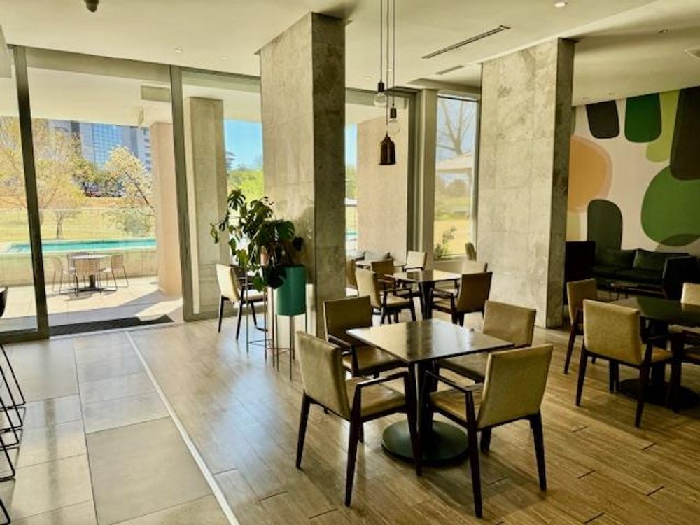 Modern complex with concierge, pool and conference facilities overlooking mushroom park.
