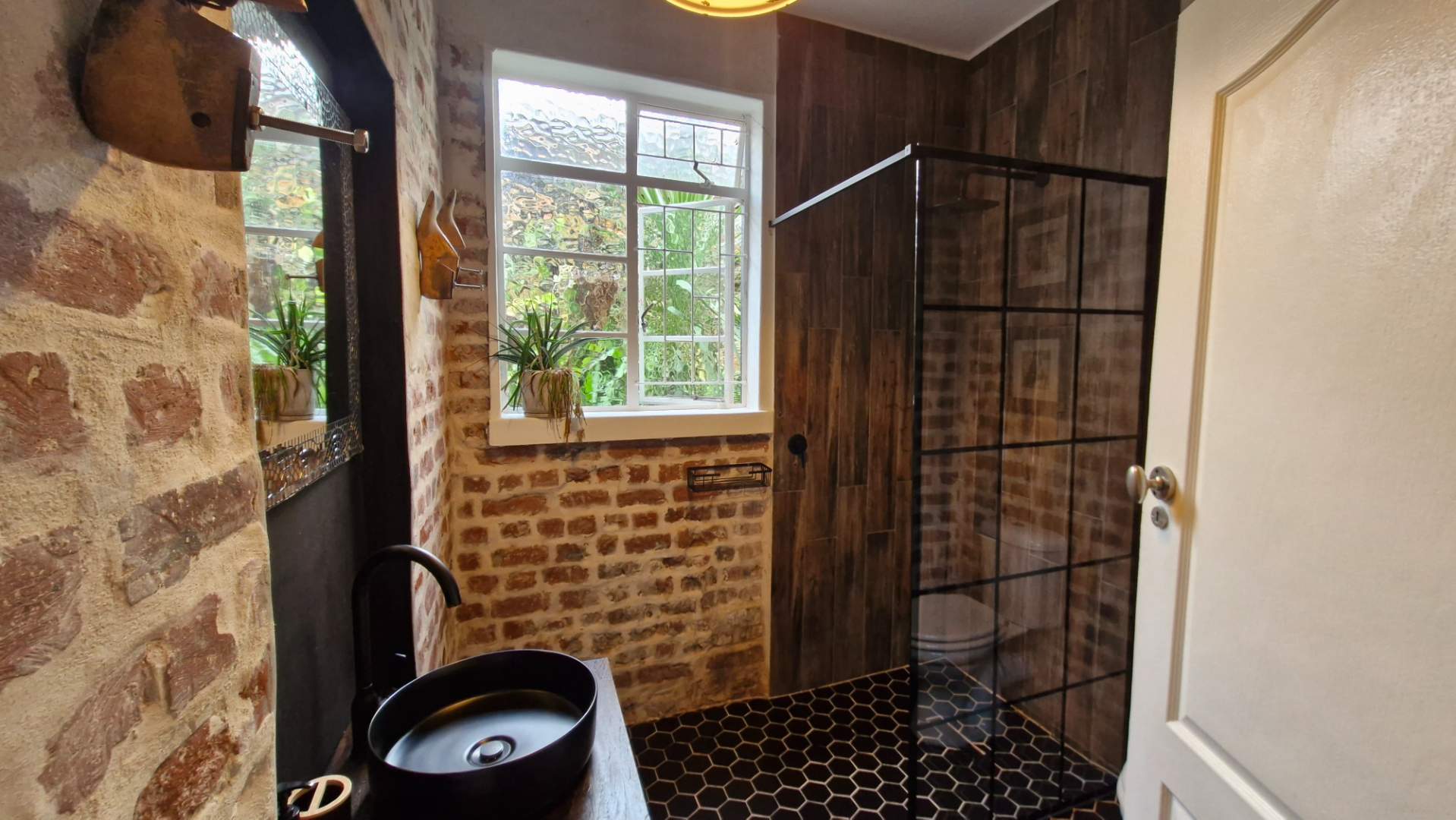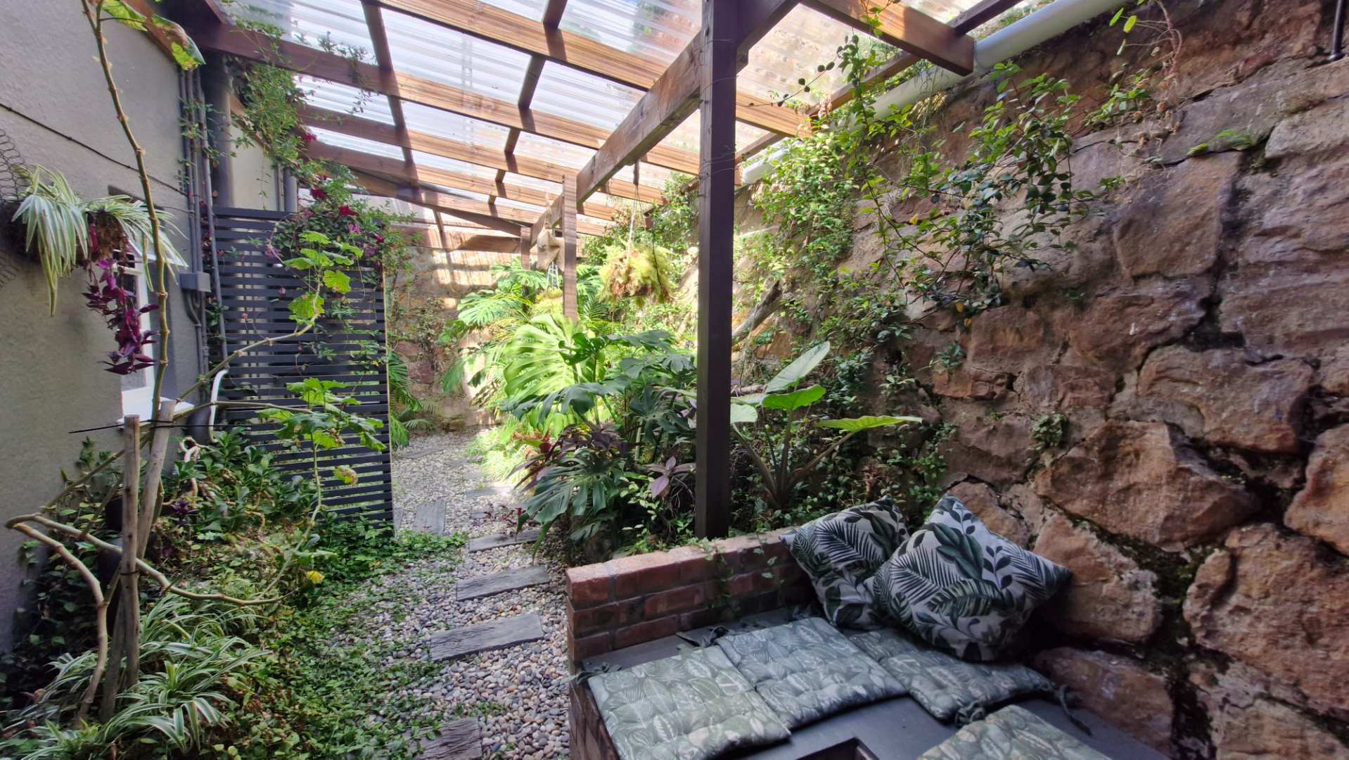 A hidden gem — a lush, private jungle-style garden, completely undercover, with its own outdoor shower and fireplace. A little world of its own.