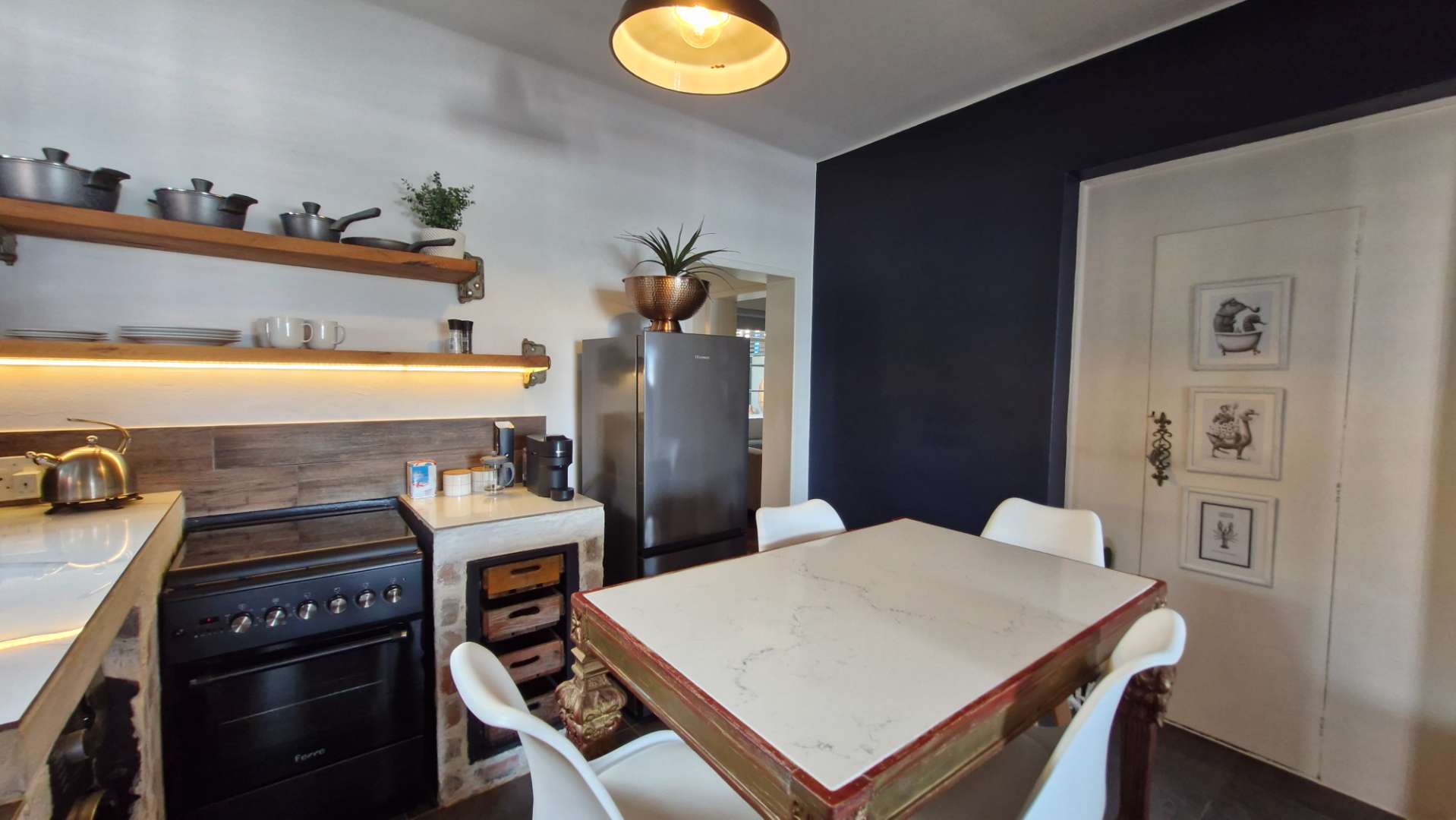 Take advantage of this special out-of-season rate — available mid-April to end of November - and step into something special on the first floor of this characterful heritage building on St George's Street, Simon's Town. This gorgeously decorated apartment is stylish, warm and fully furnished — with exposed brick walls, upmarket finishes and every detail carefully considered. Curl up on the sofa next to the fireplace with a good book on a winter's evening, or step out from the lounge onto your private undercover balcony — stretching across the front of both the lounge and master bedroom — for a breath of fresh sea air and views across the bay. A beautiful marble top intimate dining table is the perfect spot for a quiet dinner at home.
