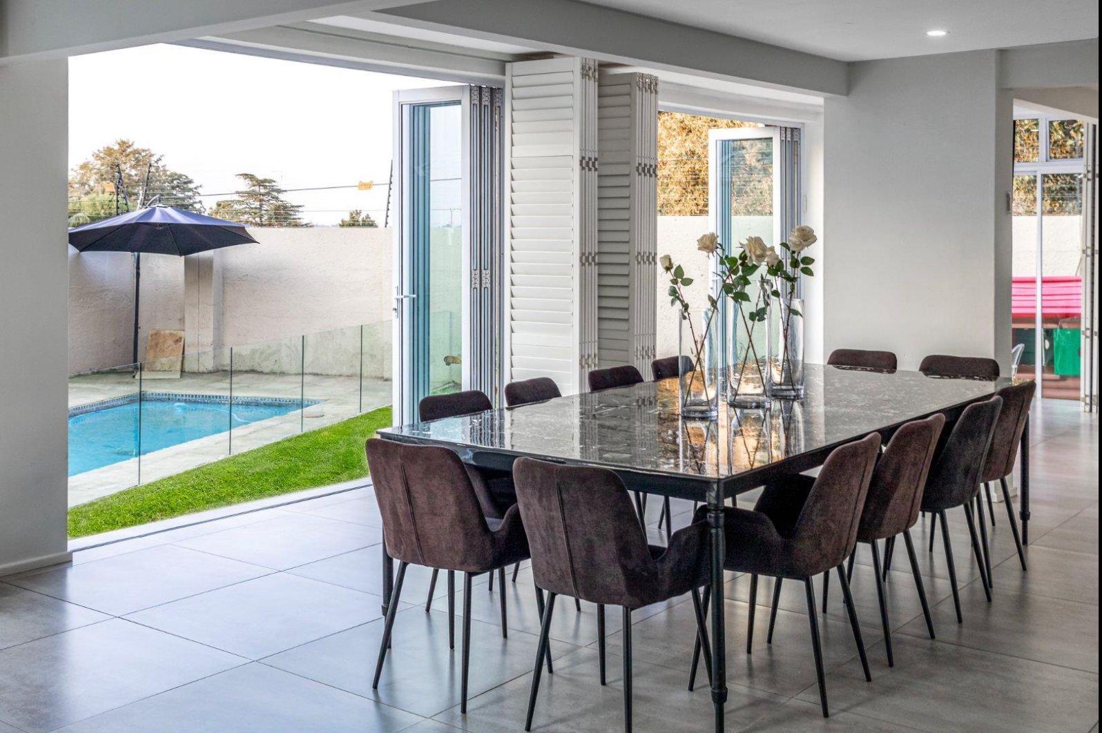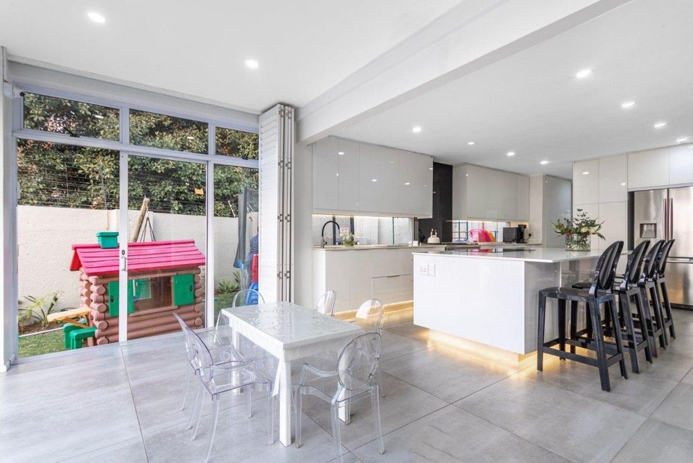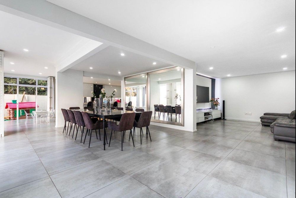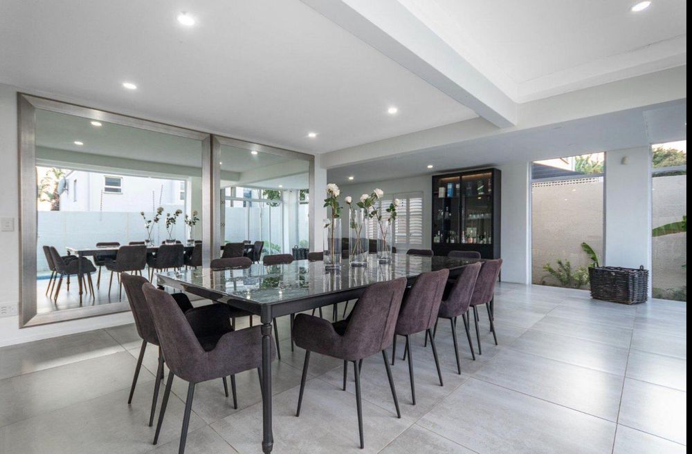 The seamless flow of the kitchen, dining room, and lounge areas is accentuated by vast palisading doors that open onto a secured, crystal-clear pool, ensconced within a meticulously manicured garden.