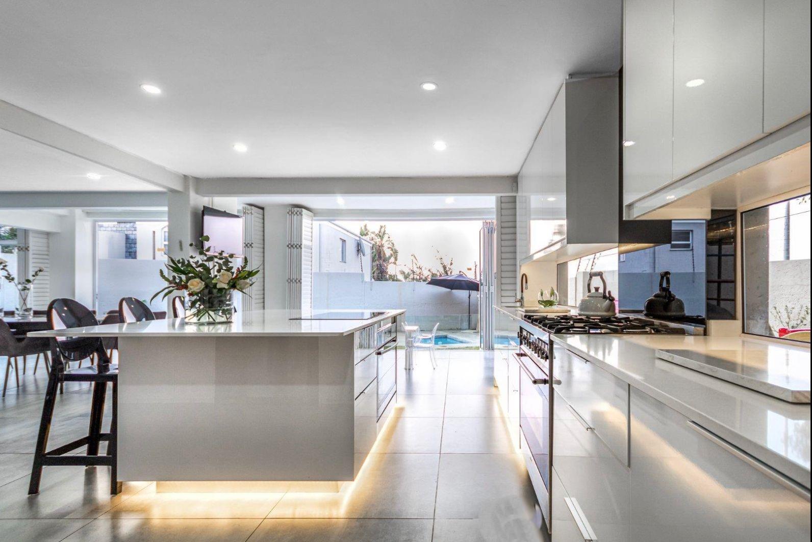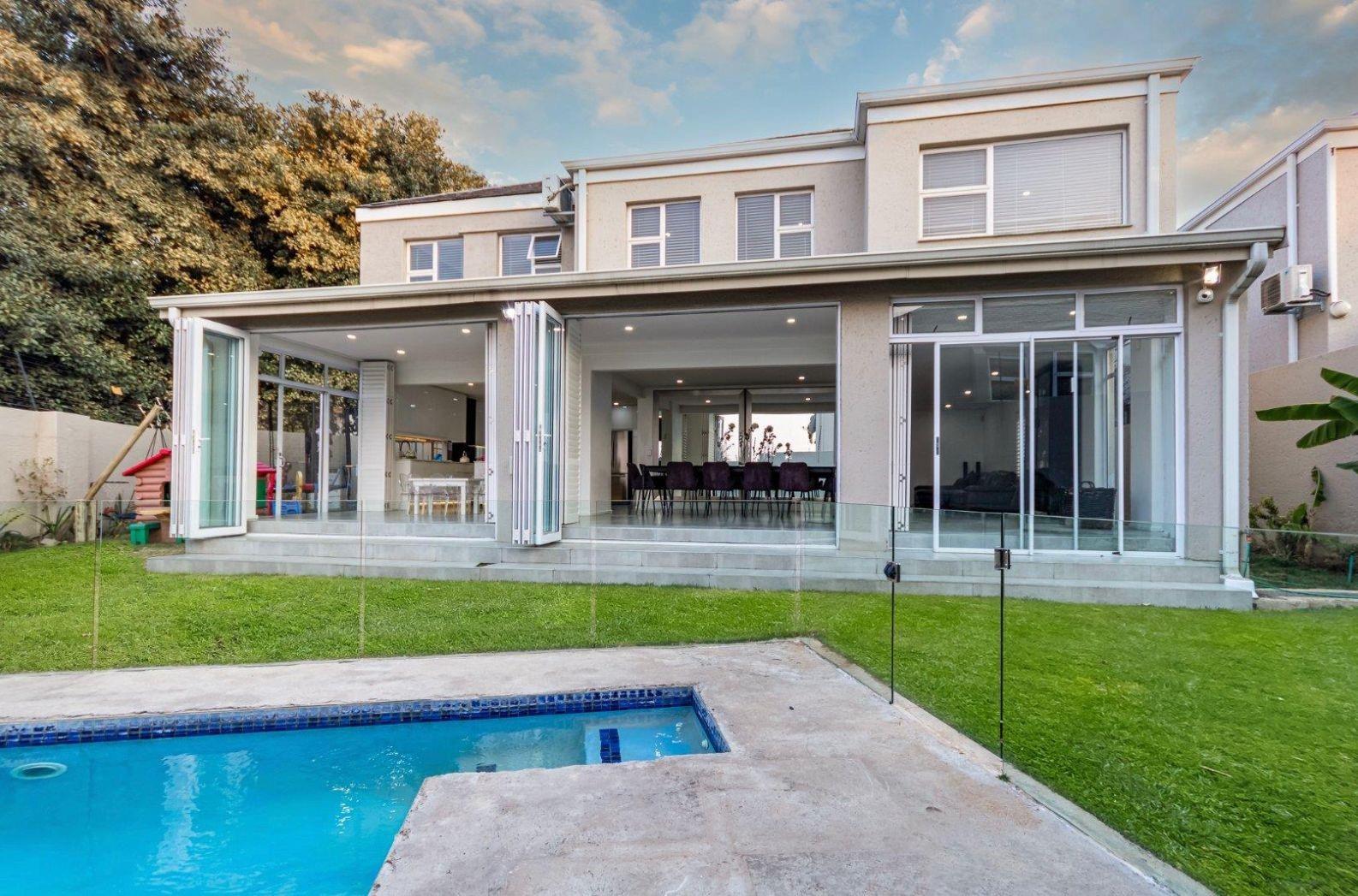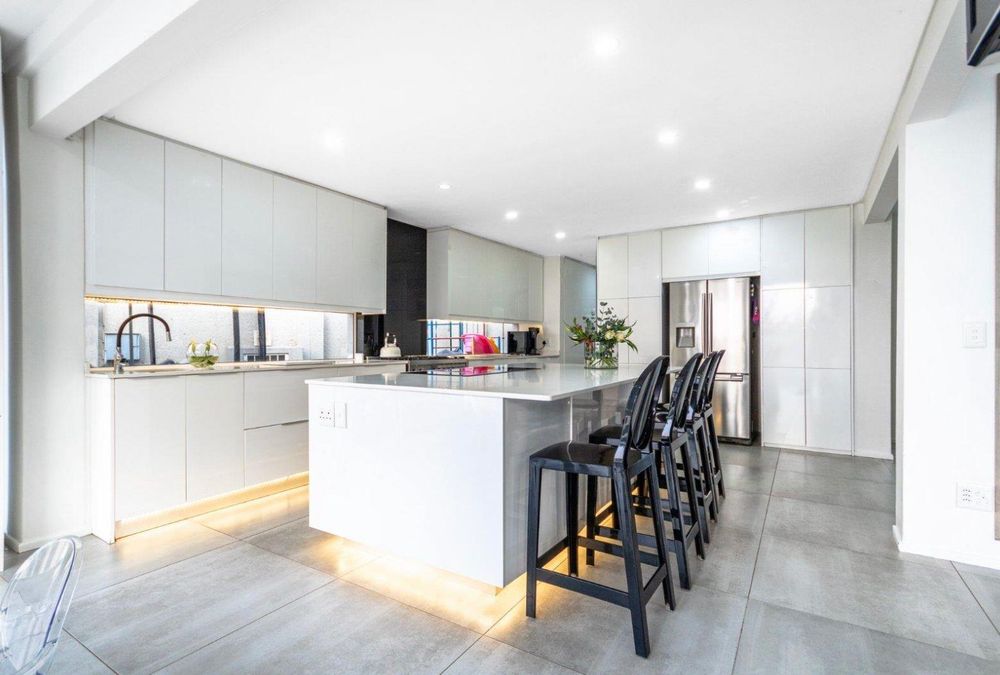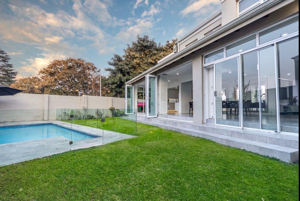 The seamless flow of the kitchen, dining room, and lounge areas is accentuated by vast palisading doors that open onto a secured, crystal-clear pool, ensconced within a meticulously manicured garden.