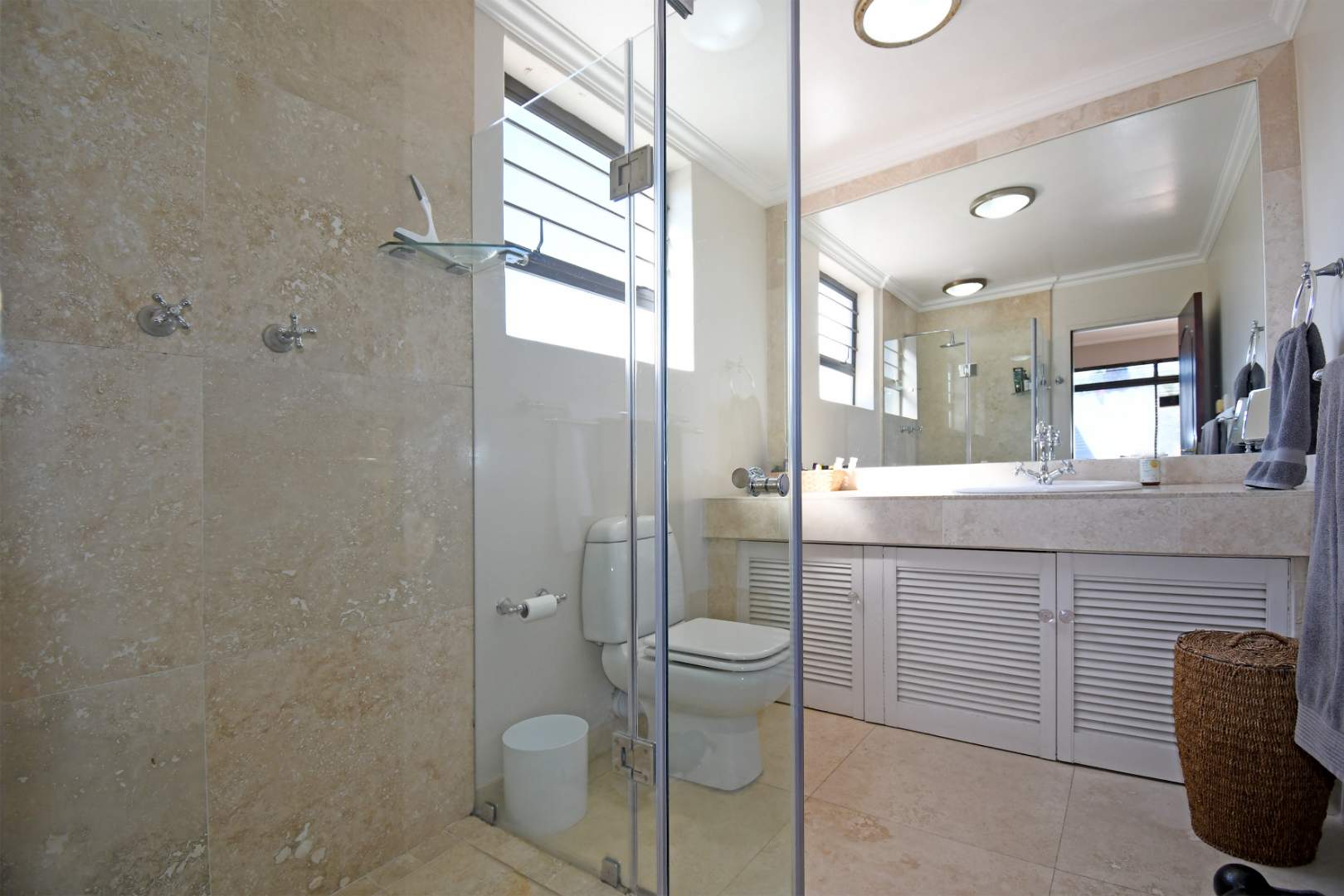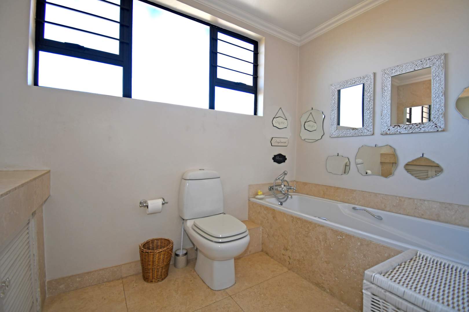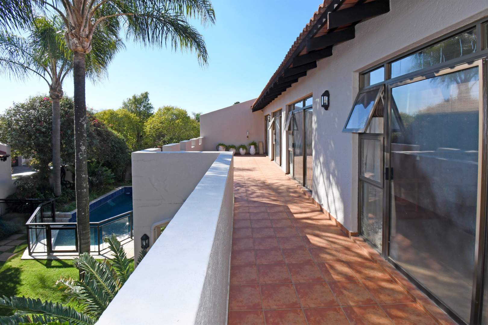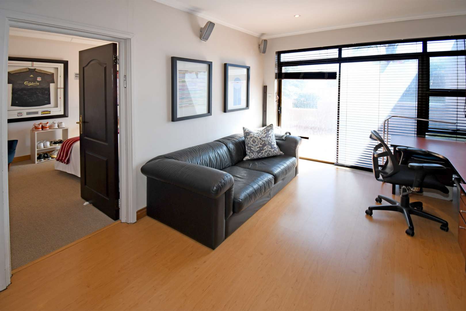Downstairs are 3 large reception rooms with solid Rhodesian teek flooring. The lounge opens onto the huge outdoor patio with space for a lounge and dining area and quartzite natural stone tiles, plus there is a heated pool and a separate guest cottage/suite
