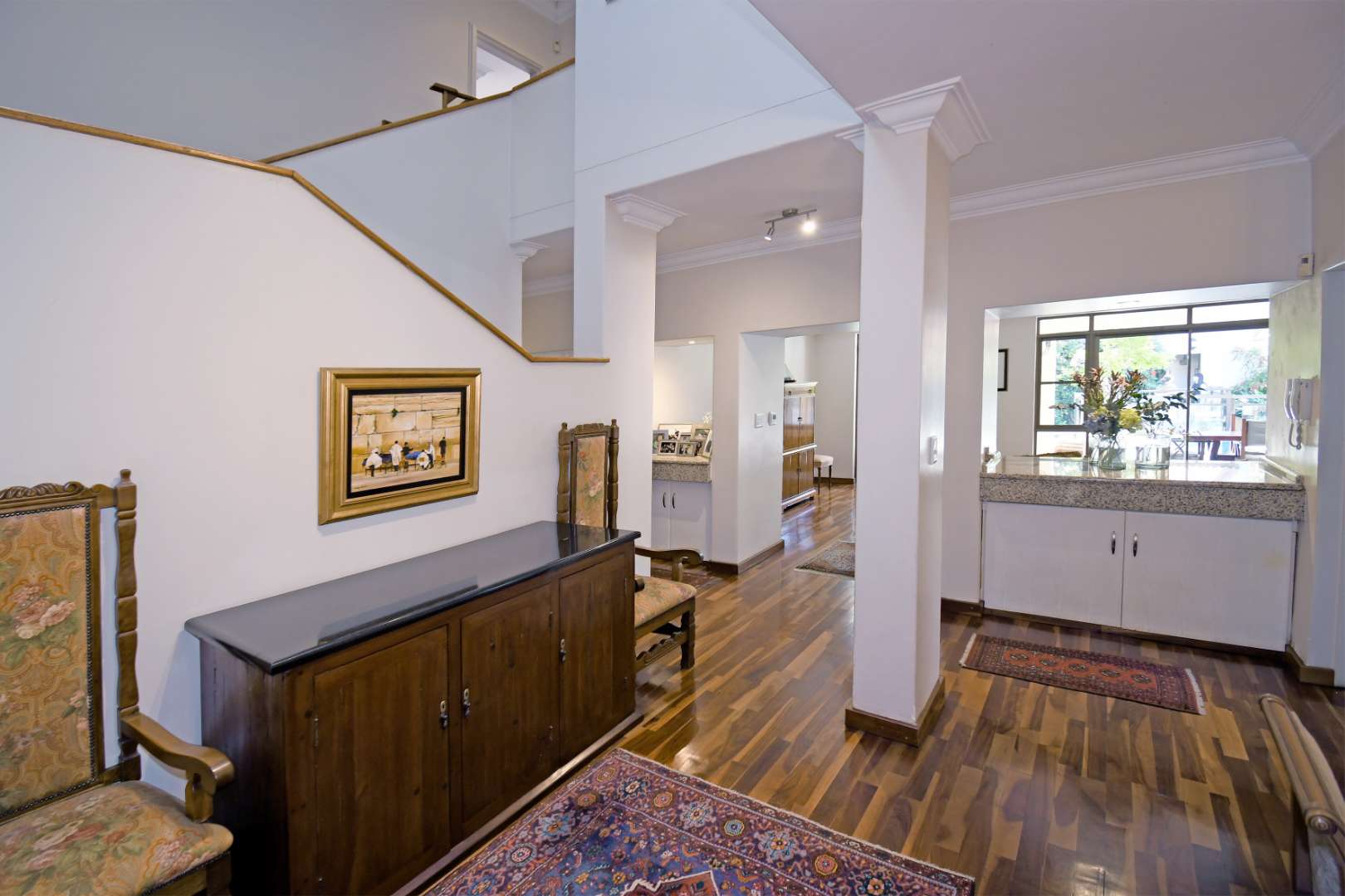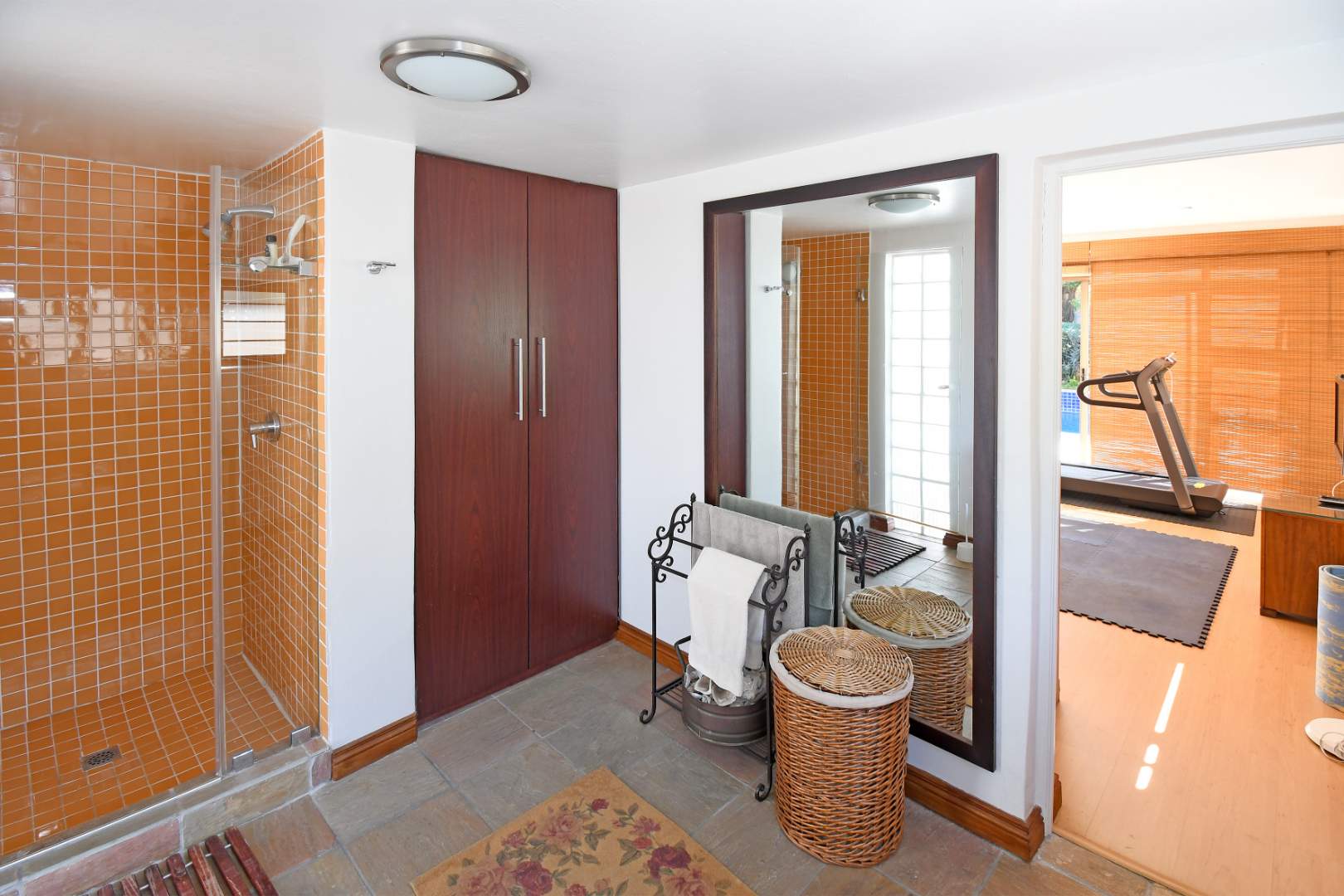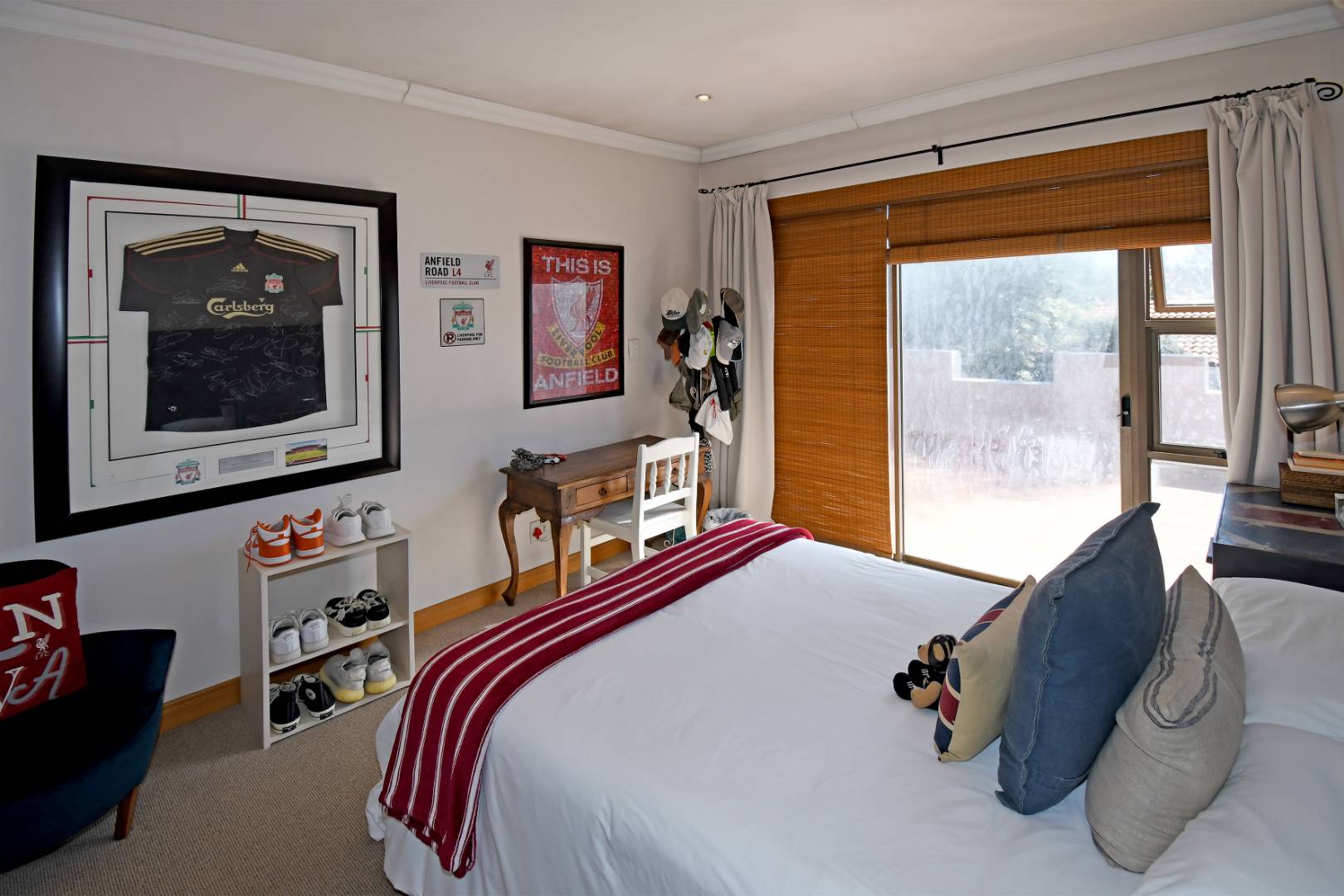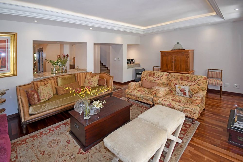 Downstairs are 3 large reception rooms with solid Rhodesian teek flooring. The lounge opens onto the huge outdoor patio with space for a lounge and dining area and quartzite natural stone tiles, plus there is a heated pool and a separate guest cottage/suite