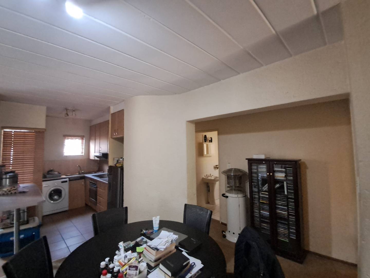 - An open plan kitchen with ample cupboards, glass top stove, and space for a washing machine and a tumble dryer.